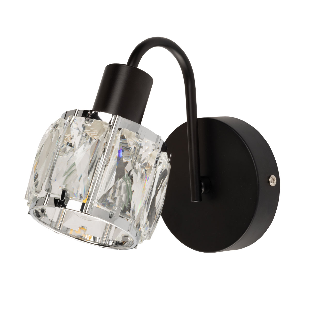 Металлическое основание настенного бра окрашено в черный цвет. Плафон декорирован прозрачным хрусталем прямоугольной формы.