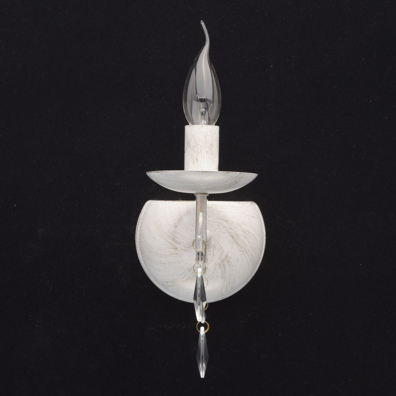 Основание из металла, окрашена по технологии хай-лайт, основной слой белого матового цвета, декоративный слой цвета золота.Декоративные элементы изготовлены из металла по технологии проката на роликовом станке, розетки - технология токарной обработки.Декор: подвески из декоративного прозрачного стекла