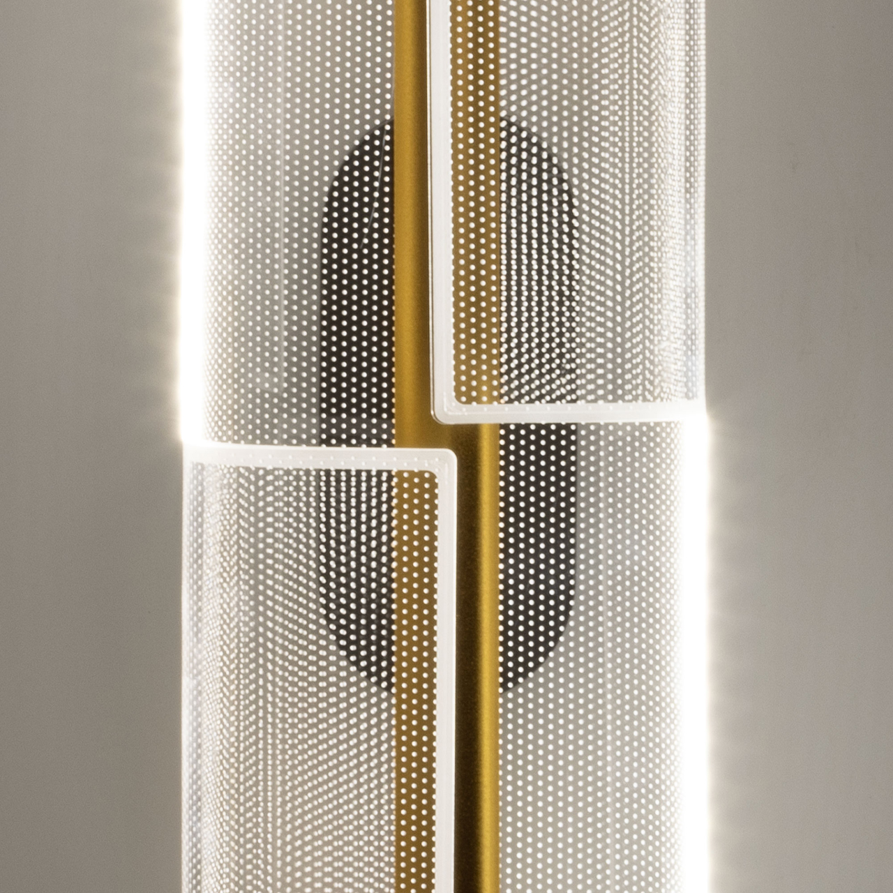 Металлический корпус настенного бра окрашен в черный цвет. Корпус плафона выполнен из сплава алюминия и окрашен в цвет золота. Настенное бра декорировано изящным элементом из прозрачного акрила с точечным рисунком.