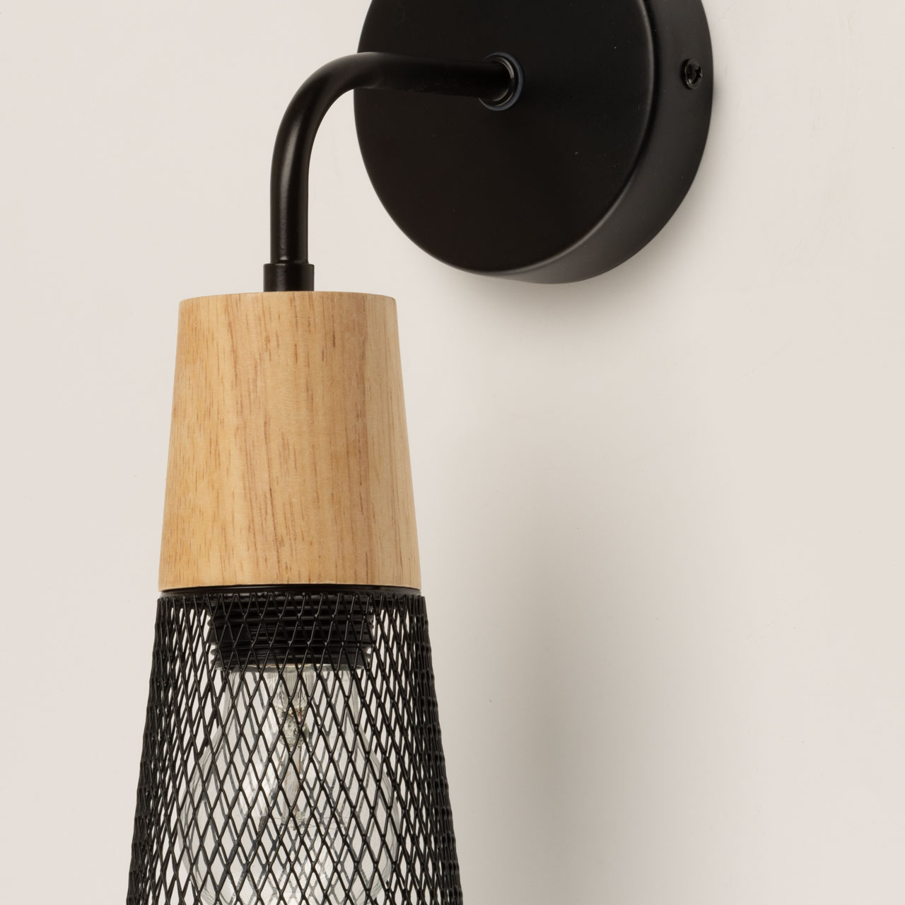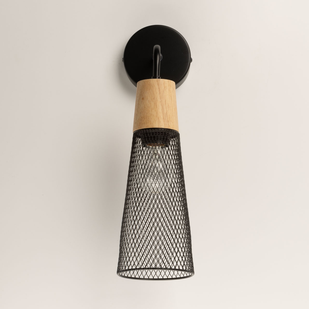 Металлическое основание и плафон бра окрашены в черный цвет. Декоративный элемент выполнен из металла с имитацией под натуральное дерево.