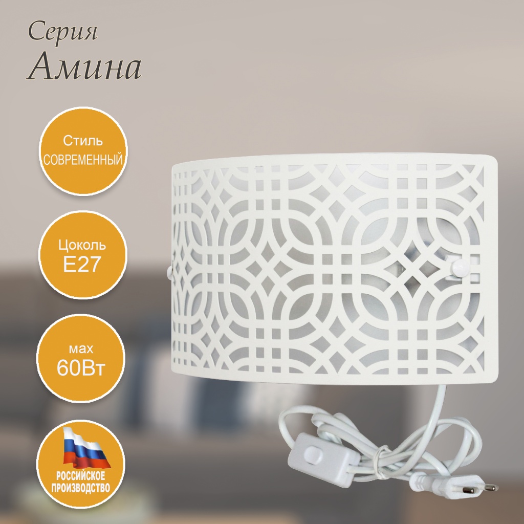Настенный светильник из коллекции Амина - это прекрасное сочетание дизайна и функциональности. Стальной каркас белого цвета и стальной плафон отлично дополнит интерьер любого помещения. Настенный светильник с плафоном из металла вырезанным с помощью лазерного станка осветит помещение площадью 3 кв. м. Рекомендуем использовать для устройства лампы накаливания с цоколем E27 и мощностью 60 W. Прибор произведен с использованием материала: металла и пвх пленки . Основным цветом товара является белый . За счет прозрачной подложки светильник мягко рассеивает свет . Данную модель 1005405252 спешите купить в интернет-магазине 220svet.