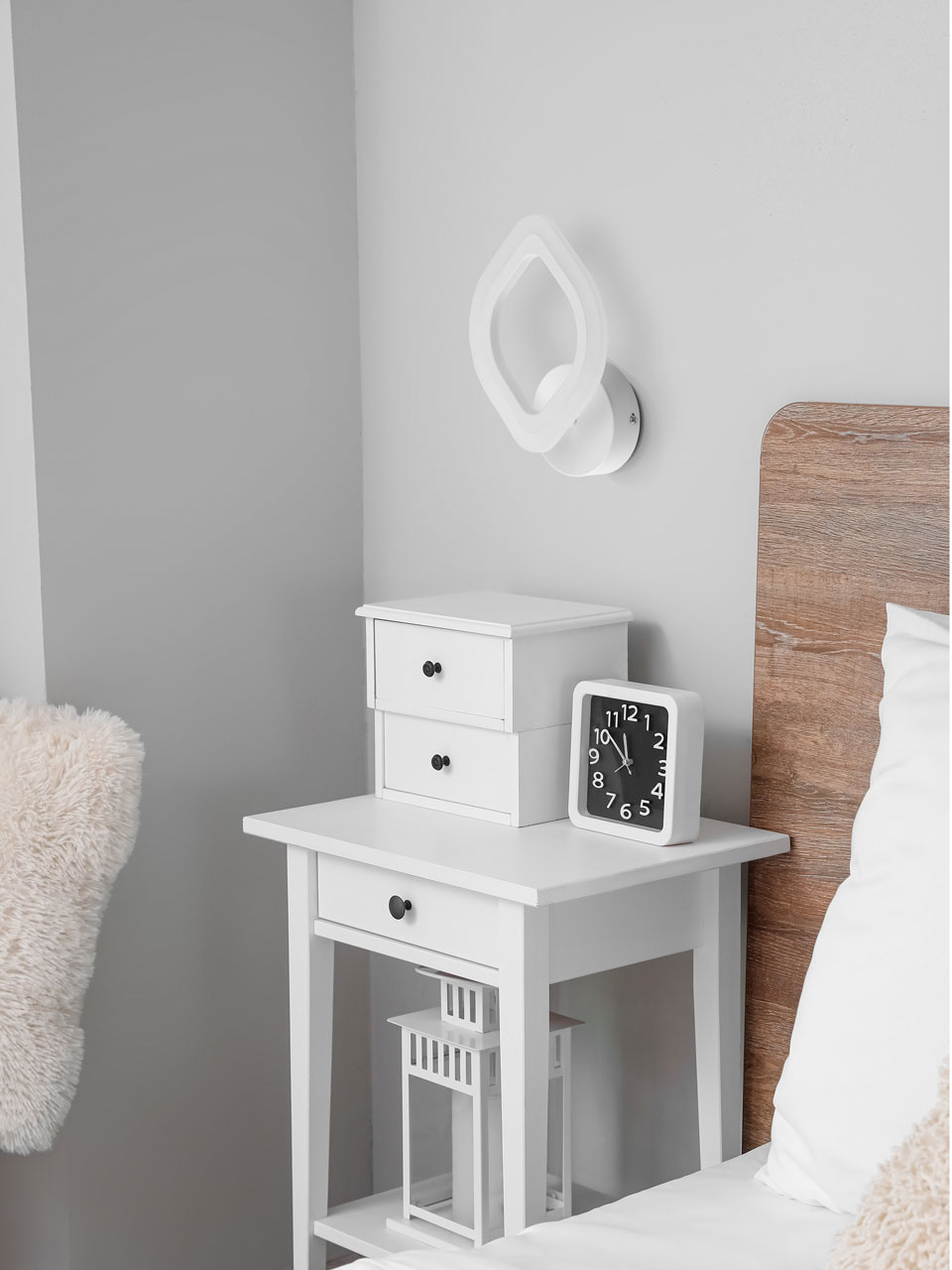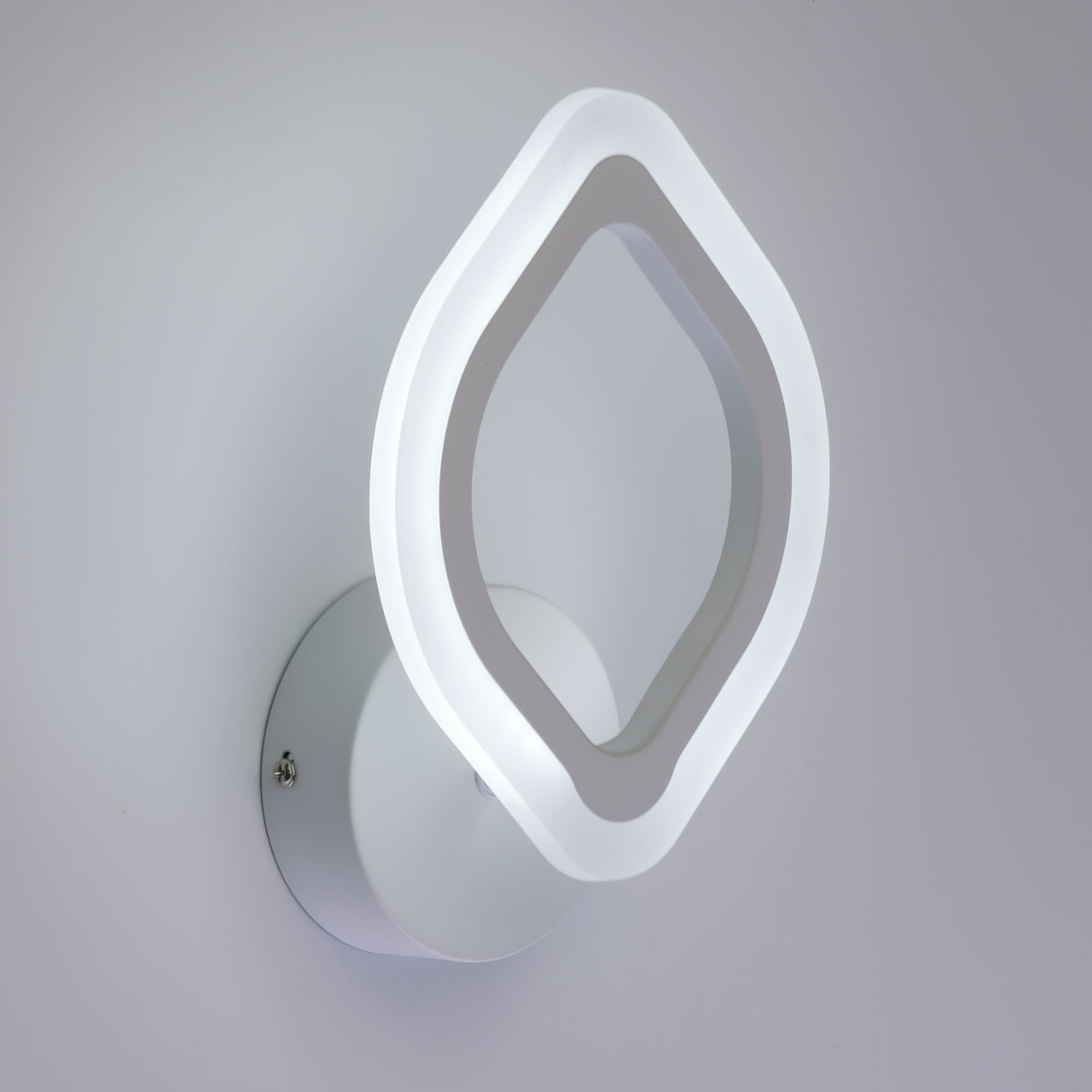 Металлическое основание настенного бра окрашено в белый цвет. Корпус плафона выполнен из сплава алюминия с цинком и окрашен в цвет основания. Светодиодные источники света закрыты белым матовым акрилом.