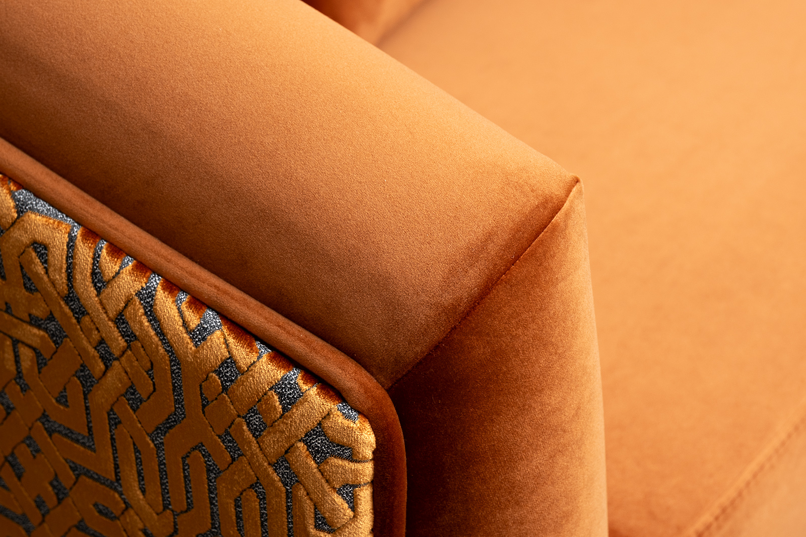 Деревянные опоры, высота 80мм. Образец на фото выполнен в тканях Paddington32(основная)+Lattice ORANG(задняя часть дивана+прямоугольные декоративные подушки).Передние опоры золото.