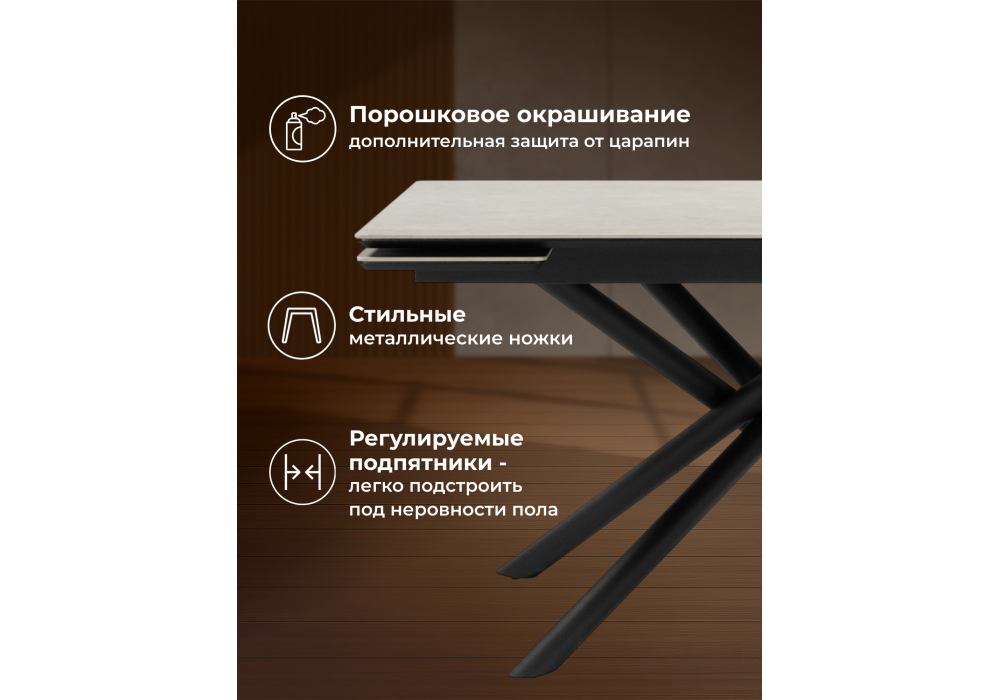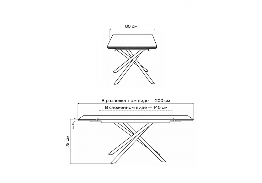 Материал каркаса - металл; Материал столешницы - Керамика; Цвет ножек - черный; Ширина - 80; Высота - 75; Длина стола в разложенном виде - 200; Длина - 140;