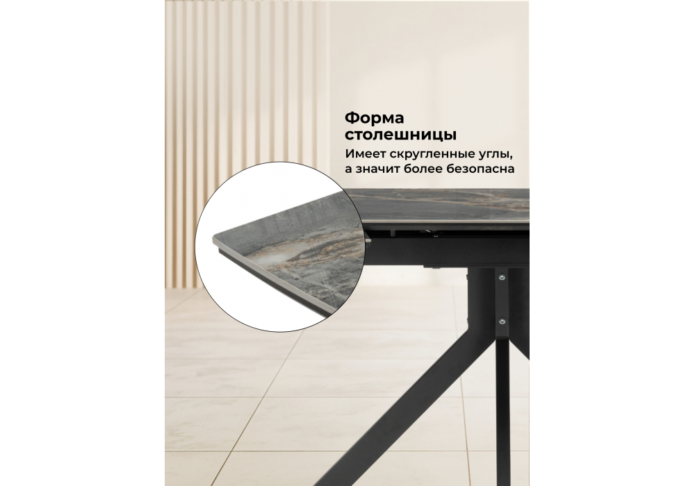 Материал каркаса - металл; Материал столешницы - Керамика; Цвет ножек - черный; Ширина - 80; Высота - 77; Длина стола в разложенном виде - 180; Длина - 120;