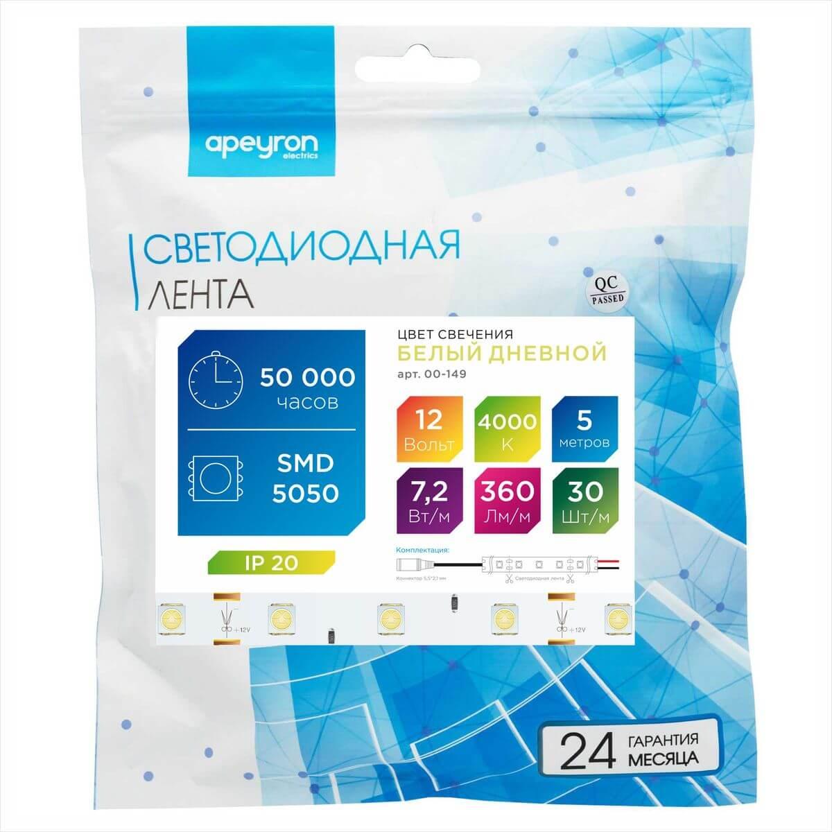 Лента Apeyron 7, 2W/m 30Led/m 5050SMD дневной белый 5M 00-149 в Подольске