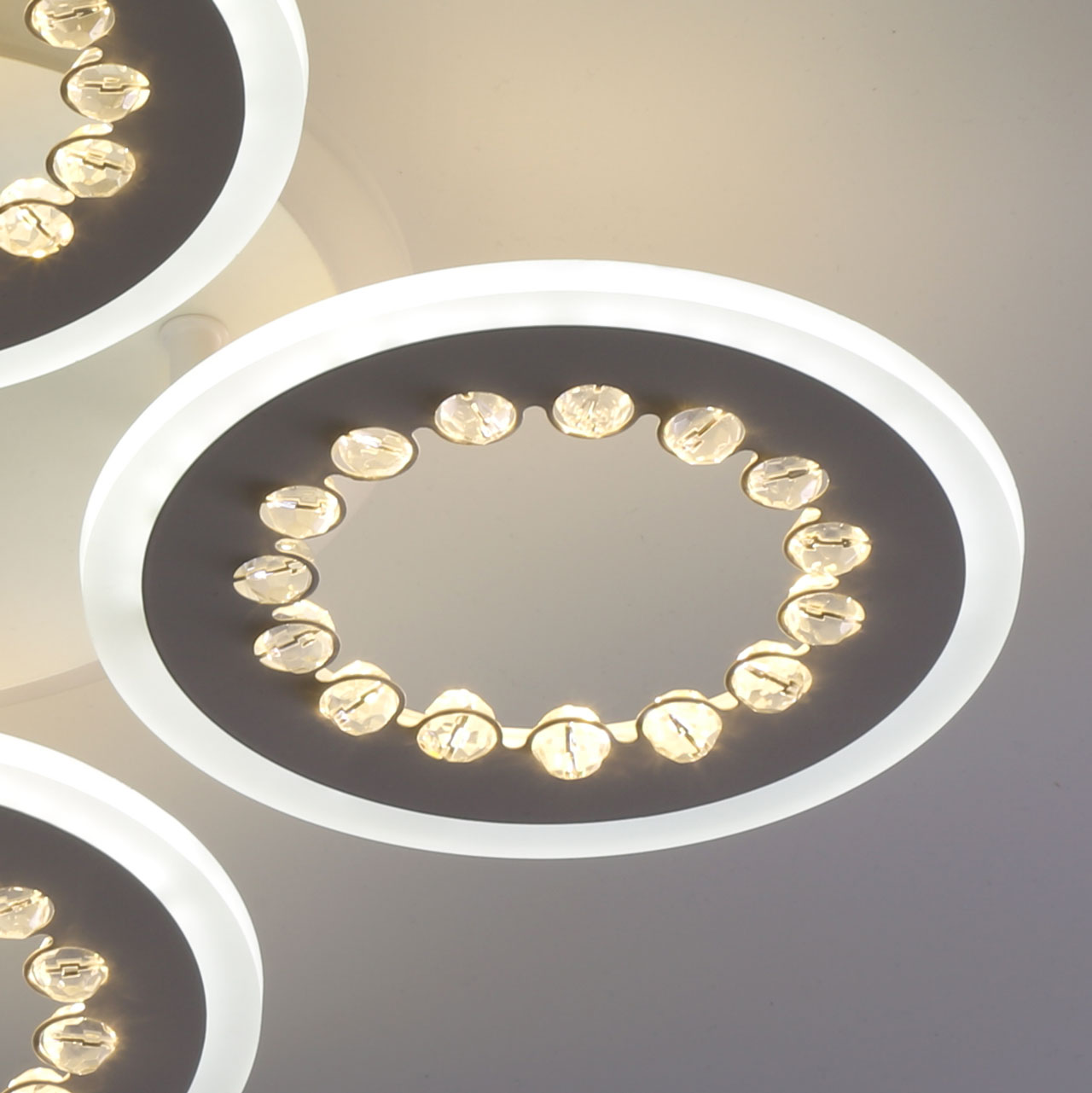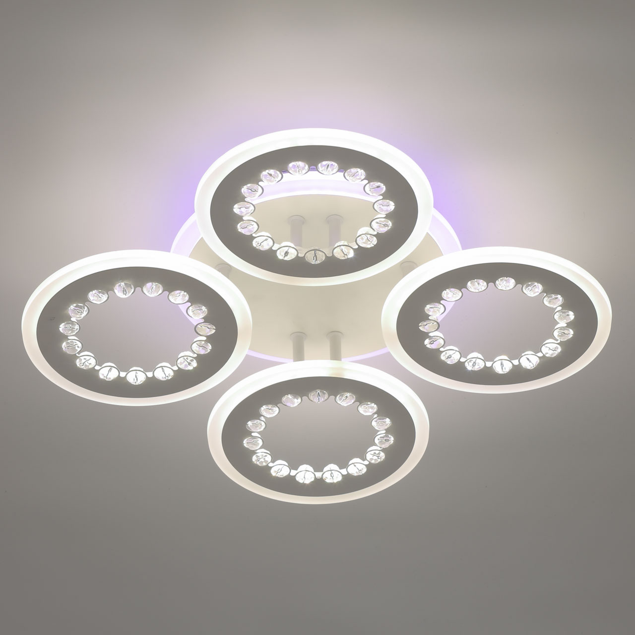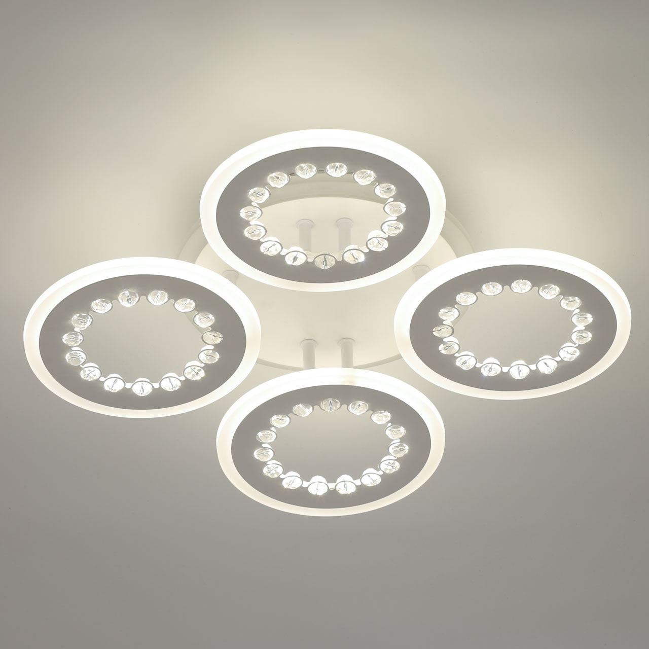 Металлическое основание и плафоны потолочной люстры окрашены в белый цвет. Светодиодные источники света закрыты белым матовым акрилом. Потолочная люстра декорирована бусинами из прозрачного акрила. Дополнительно, в светильнике предусмотрена подсветка потолочной чаши. Светильник приходит в состоянии частичной сборки в компактной упаковке: вся электрика подсоединена, достаточно закрепить плафоны на корпусе.