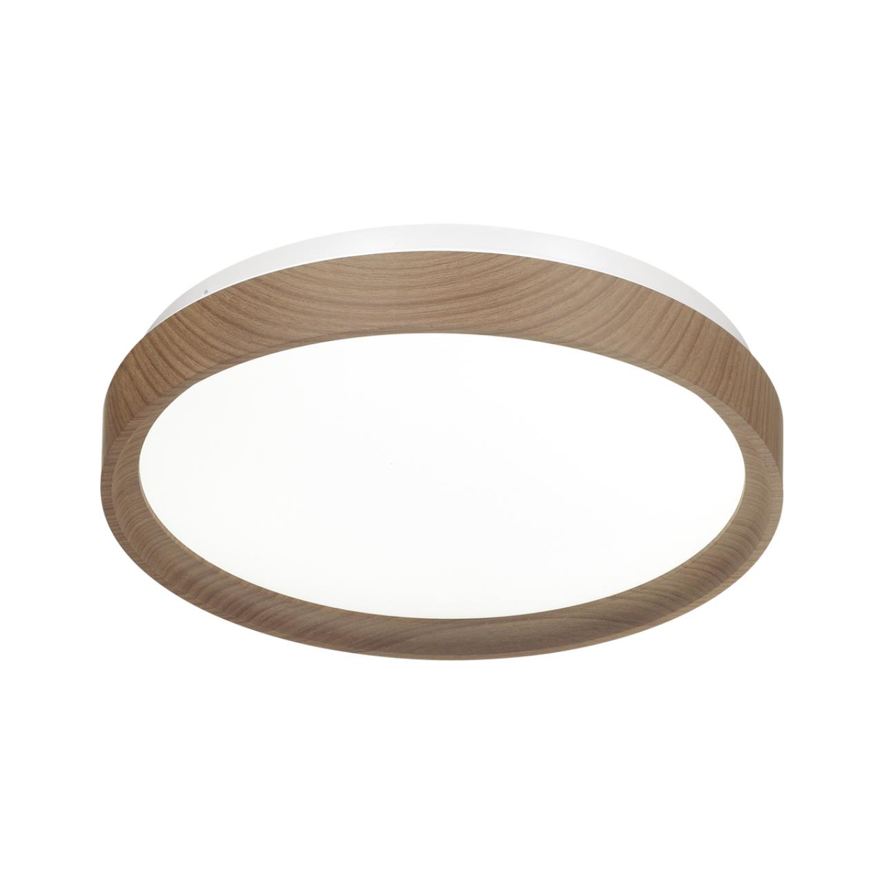 Светильник 7603/ELN линии WOODI состоит из металлического основания (базы) и пластикового рассеивателя. Материал рассеивателя - высококачественный пластик марки PMMA 2.0 белого цвета с матовой поверхностью, без текстуры. Пластик обеспечивает светильнику равномерное рассеивание и хорошее светопропускание. Форма плафона: круглая, декорирована ободом светло-коричневого цвета "под дерево". Степень защиты IP43 позволяет использовать светильник в определенных зонах влажных помещений. В комплект входит LED модуль с линзами, мощностью 76Вт, которая соответствует лампе накаливания 740Вт. А также переключатель температуры цвета (ССT) на драйвере, с помощью которого осуществляется изменение цветовой температуры 3000/4000/6000К и переход светильника в режим теплого/белого/холодного света. Для установки необходимого режима рекомендуется использовать удлиненный тонкий предмет типа небольшой отвертки.