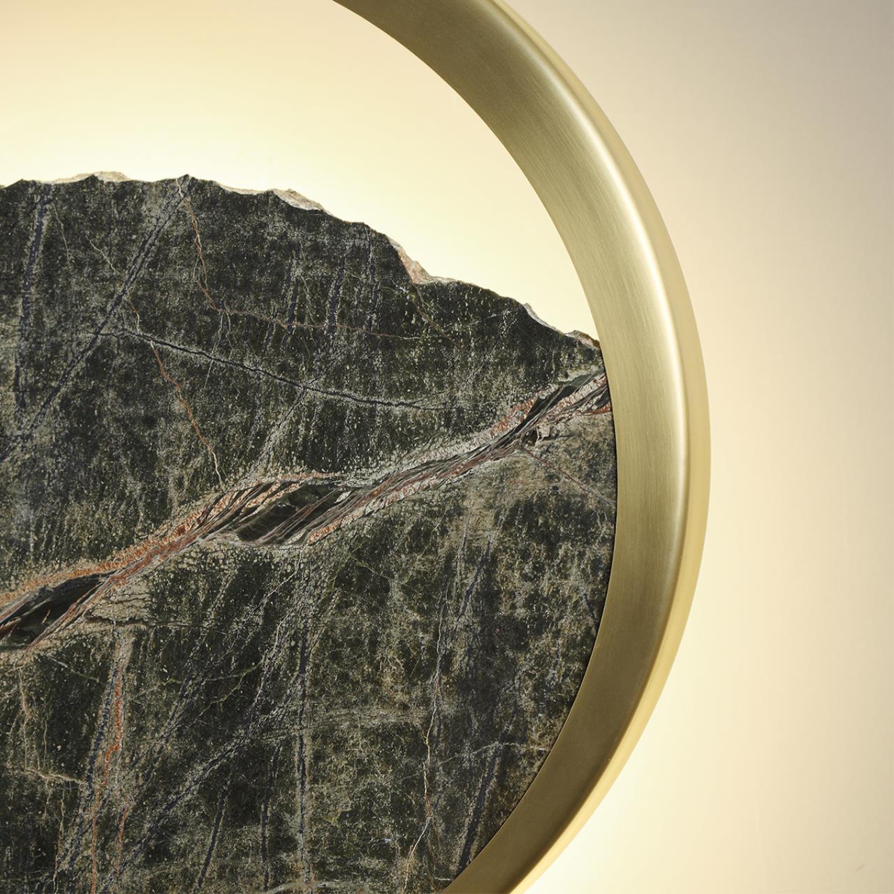 Светильники Valley воплощают предзакатное солнце в обрамлении бронзовых линий. Они выполнены из слэба мрамора с нарочито подрубленным краем, освещенным отраженным светом. В светильниках используется мрамор Bidasar Green/Rain Forest, оттенки которого могут варьироваться от темно-зеленого до светлого с прожилками от белого цвета до коричневого.