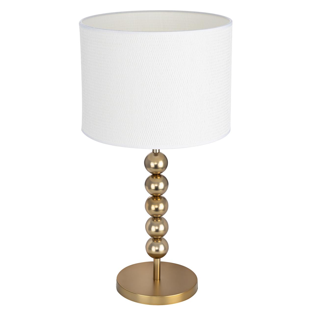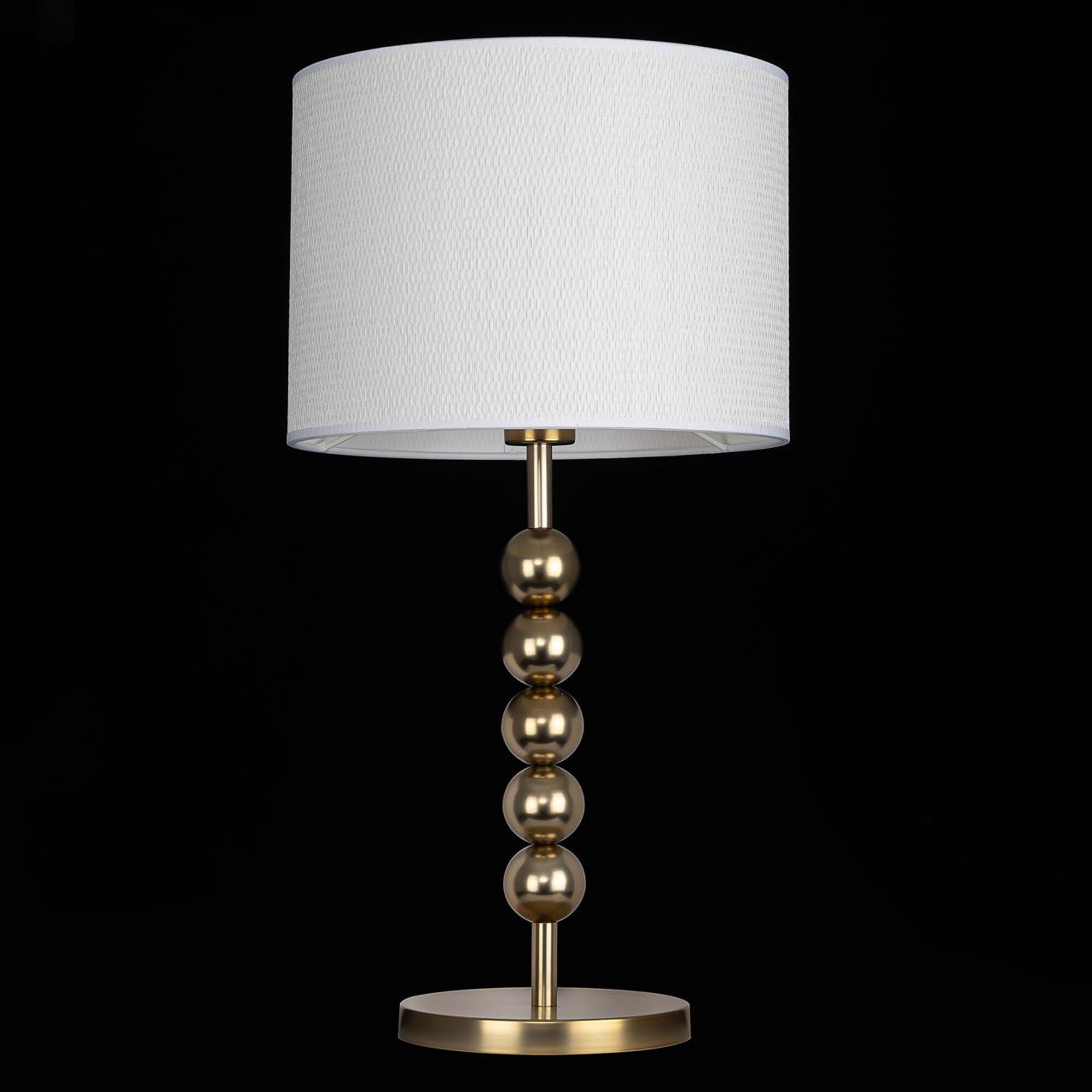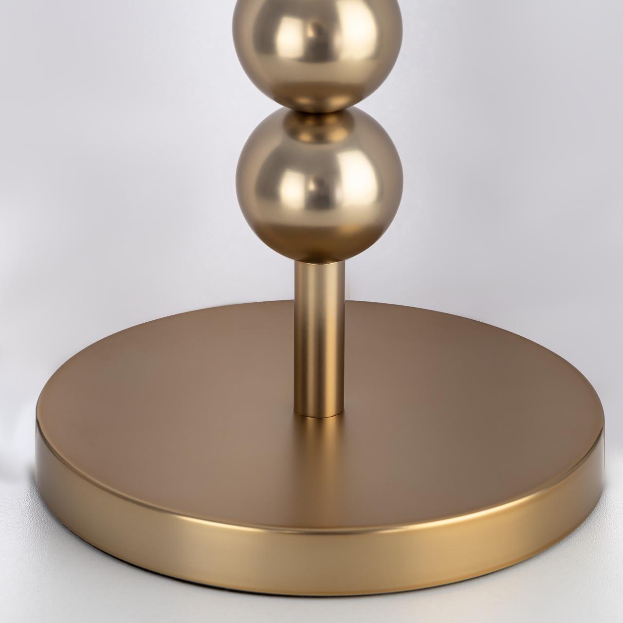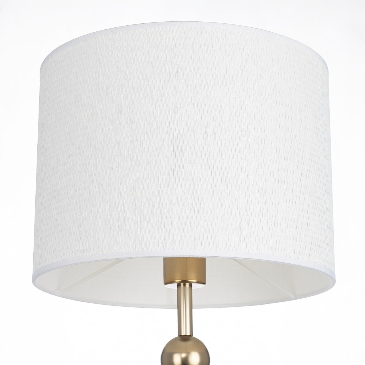 Металлический золотистый каркас светильника дополняют декоративные элементы — несколько шариков на стойке. Цилиндрический абажур из белого матового текстиля создает мягкое заливное освещение, которое придаст уюта вашей гостиной, спальне или коридору.