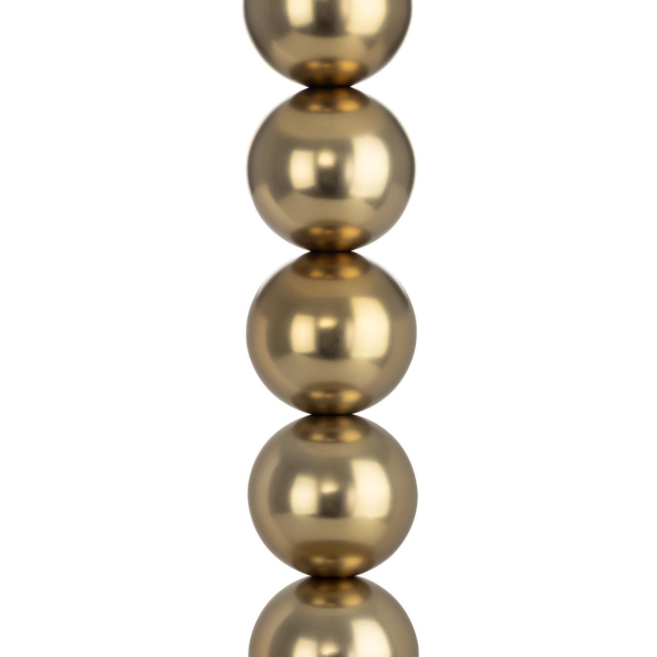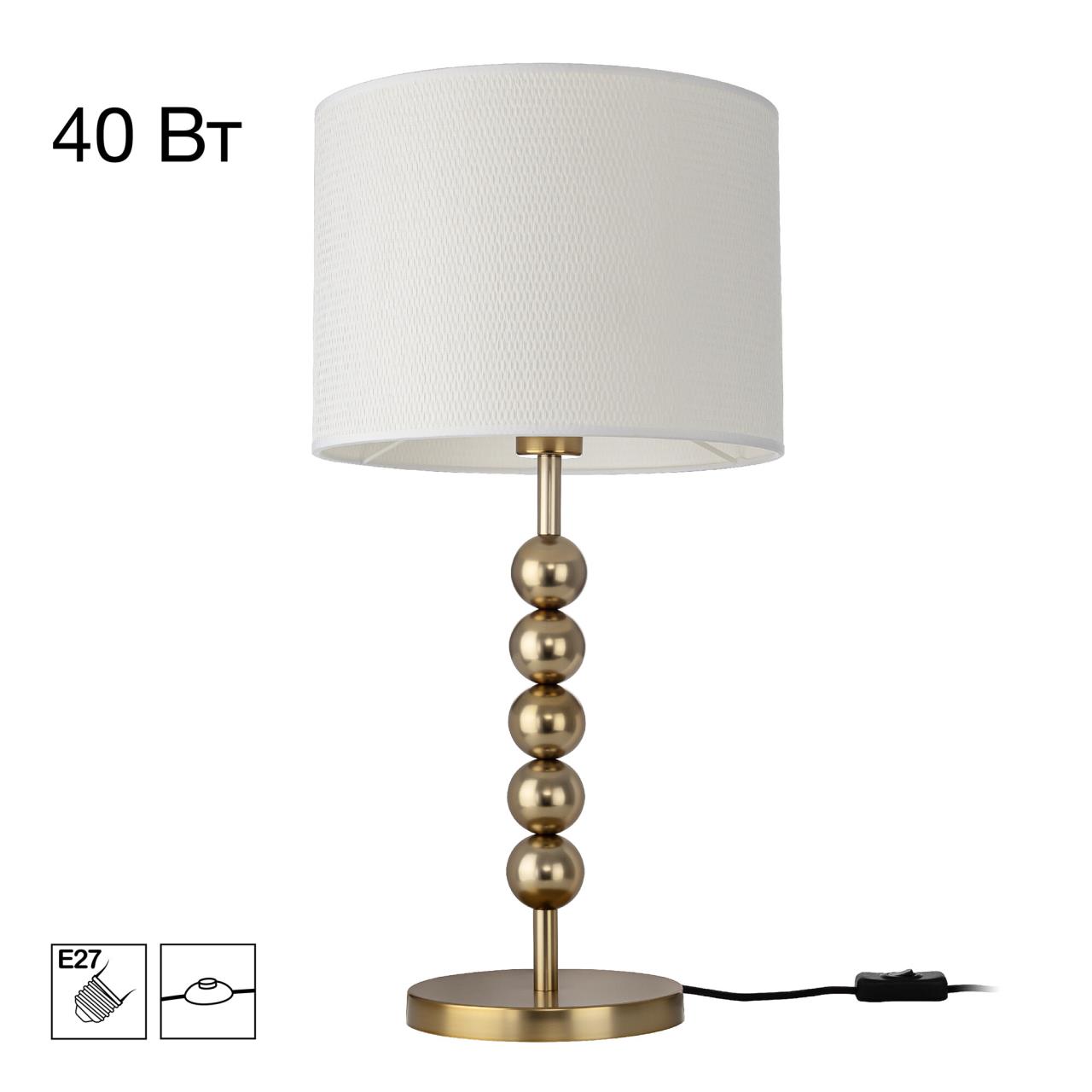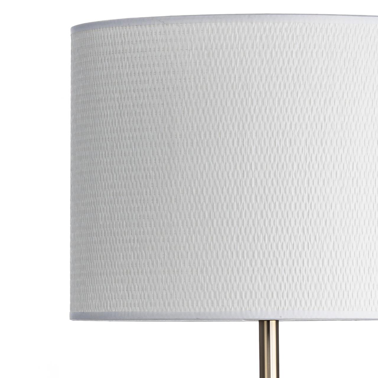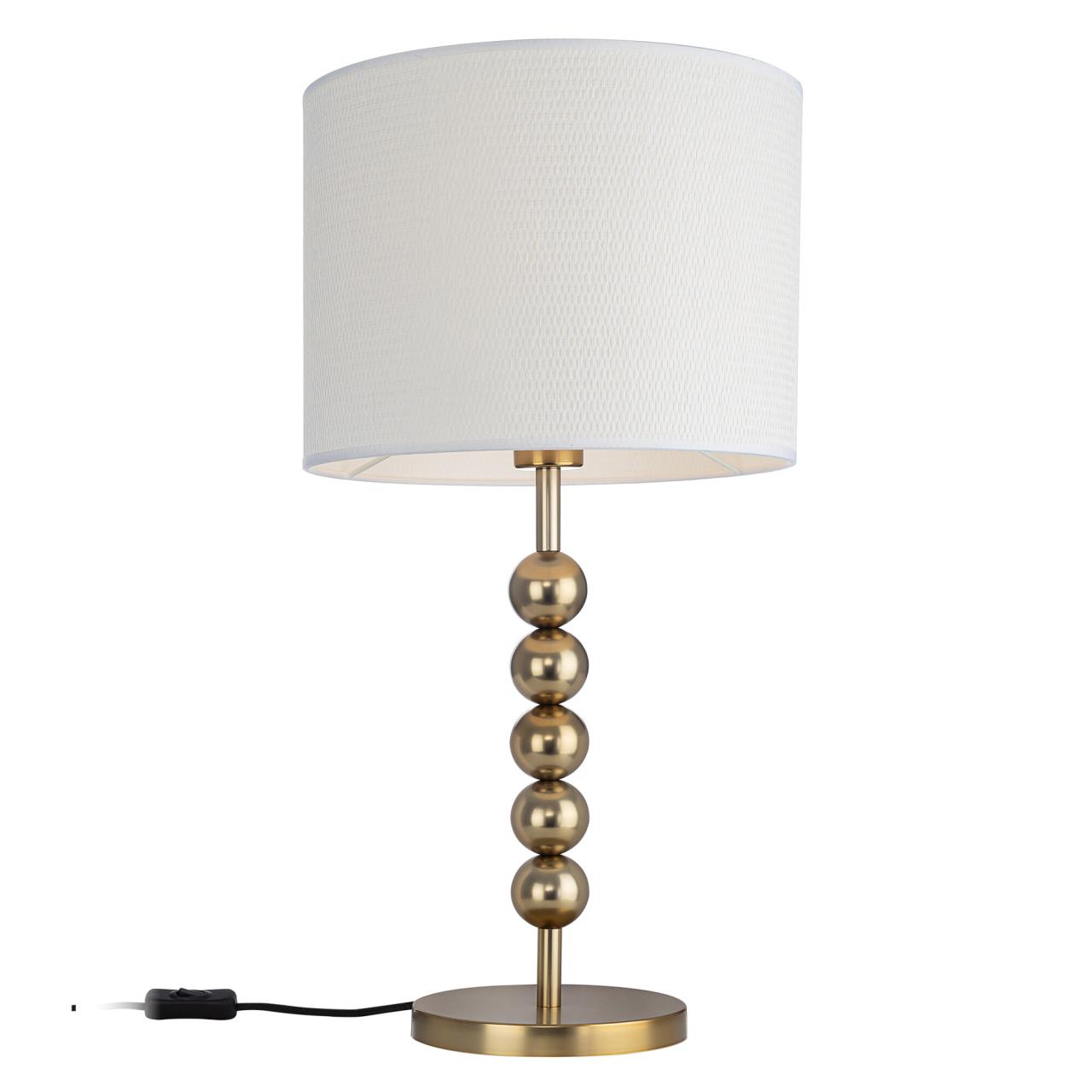 Металлический золотистый каркас светильника дополняют декоративные элементы — несколько шариков на стойке. Цилиндрический абажур из белого матового текстиля создает мягкое заливное освещение, которое придаст уюта вашей гостиной, спальне или коридору.