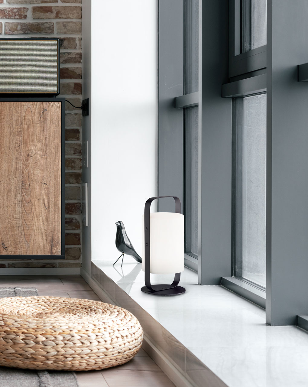 Металлическое основание настольной лампы окрашено в черный цвет. Светодиодный источник света белый, теплый+RGB закрыт белым матовым акрилом. Пульт и зарядный кабель USB входят в комплект.