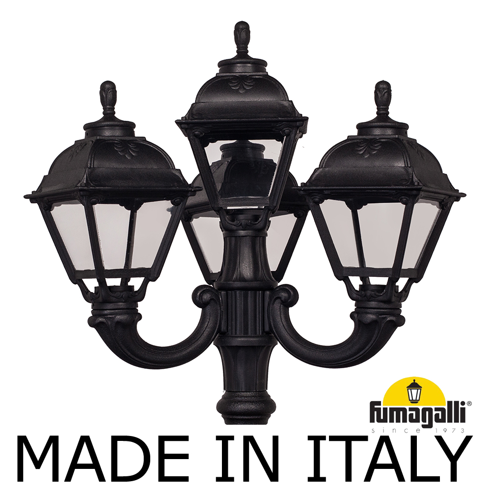 Парковый фонарь FUMAGALLI среднего размера серии CEFA, модель TABOR OFIR/CEFA 3L+1. Парковый фонарь с 3 светильниками на консолях OFIR + 1 венчающий, установленных на классическом столбе TABOR высотой 3,0 м (+высота фонарей на кронштейнах). Изготовлены в Италии, по уникальным технологиям "FUMATECH" из современного композитного полимера RESIN. Этот материал в 5 раз прочнее металла, не ржавеет, не окисляется, не выгорает на солнце, его не нужно красить. Все светильники пыле-влаго защищены по стандарту IP55 (Пылезащищенные, защита от водяных струй с любого направления). Рассеиватель выполнен из антивандального, не мутнеющего и не горючего PMMA (ПолиМетилМетаАкрилат). Срок службы светильника - не менее 20 лет. Температура использования от -60 до +90. В серии CEFA есть садовые фонари в настенном (OFIR/CEFA, MIRRA/CEFA) подвесном (SICHEM/CEFA) и наземном исполнении (IAFAET.R/CEFA, ALOE.R/CEFA, ARTU/CEFA, GIGI/CEFA, RICU/CEFA, NEBO/OFIR/CEFA 1L, NEBO/OFIR/ANNA 2L, TABOR/ADAM/CEFA 3L) со столбами разной высоты, с разным количеством и конфигурацией голов. Консоли настенных фонарей и кронштейны светильников на столбах освещения могут устанавливаться в положение вверх и вниз. Столбы выше 150 см имеют в основе мощную стальную трубу с двойной оцинковкой. При заказе требуется выбрать цвет корпуса, цвет плафона и тип патрона (Е-27 или LED GX-53). Возможен светодиодный вариант. По стилю и дизайну серия уличных светильников CEFA похожа на светильники большого размера серии SIMON . По размеру относится к средним парковым светильникам как серия RUT и GLOBE 300.