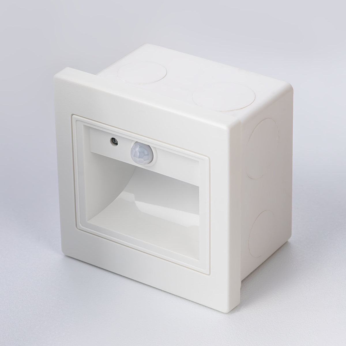 Светильник квадратной формы, корпус изготовлен из прочного полимера белого цвета. Для удобства монтажа, поставляется в комплекте с установочной коробкой.