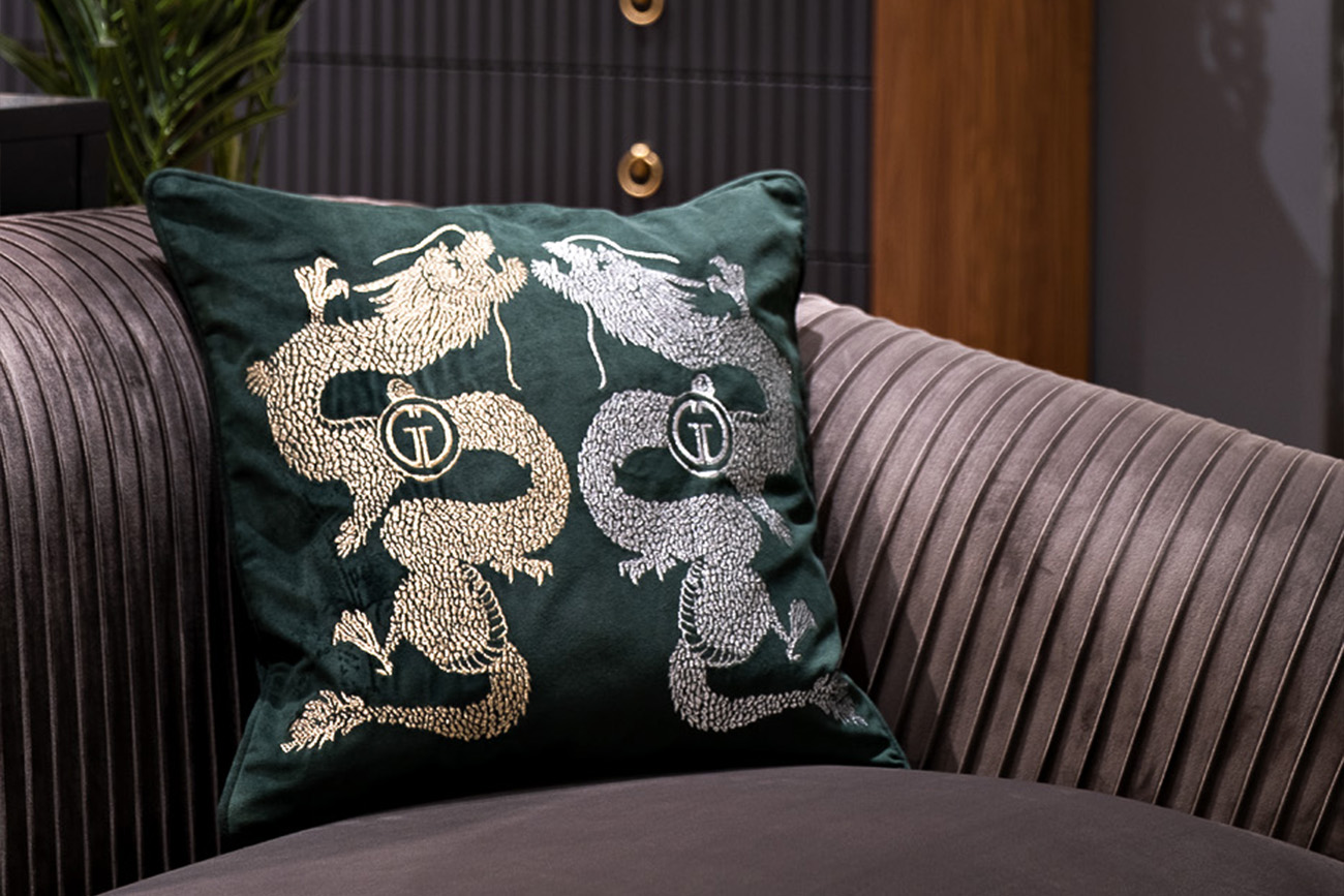 Декоративная подушка с вышивкой – то, что добавит интерьеру индивидуальности, стиля и яркости. С таким красивым текстильным декором мягкая мебель никогда не будет выглядеть скучно. Подушка на диван выполнена из материала с тактильно приятной фактурой, высокой устойчивостью к износу и деформациям. Вышивка в виде символа этого года – драконов, выполнена с эффектом золотых и серебряных нитей, что делает декор еще более изысканным и визуально дорогим.