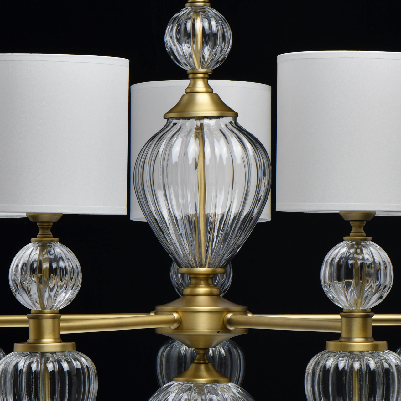 Основание светильника выполнено из металла и гальванизировано в цвет латуни. Светильник декорирован выдувным стеклом ручной работы. Текстильные абажуры белого цвета с термостойким акрилом внутри, отделаны кантом и прошиты.