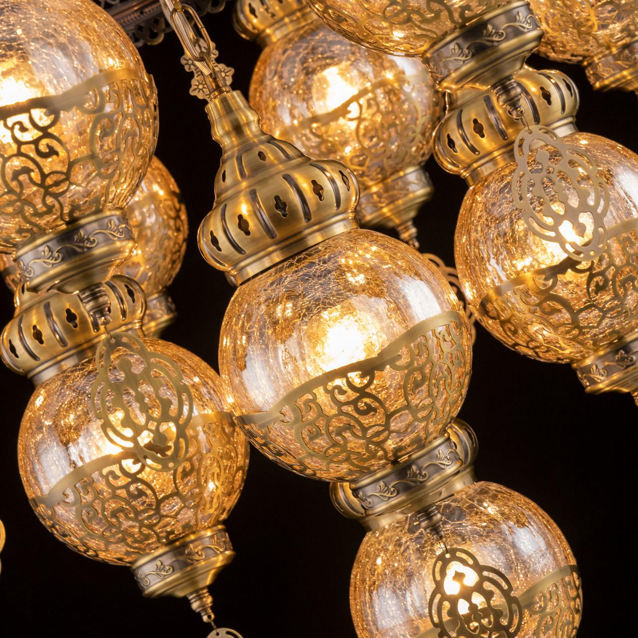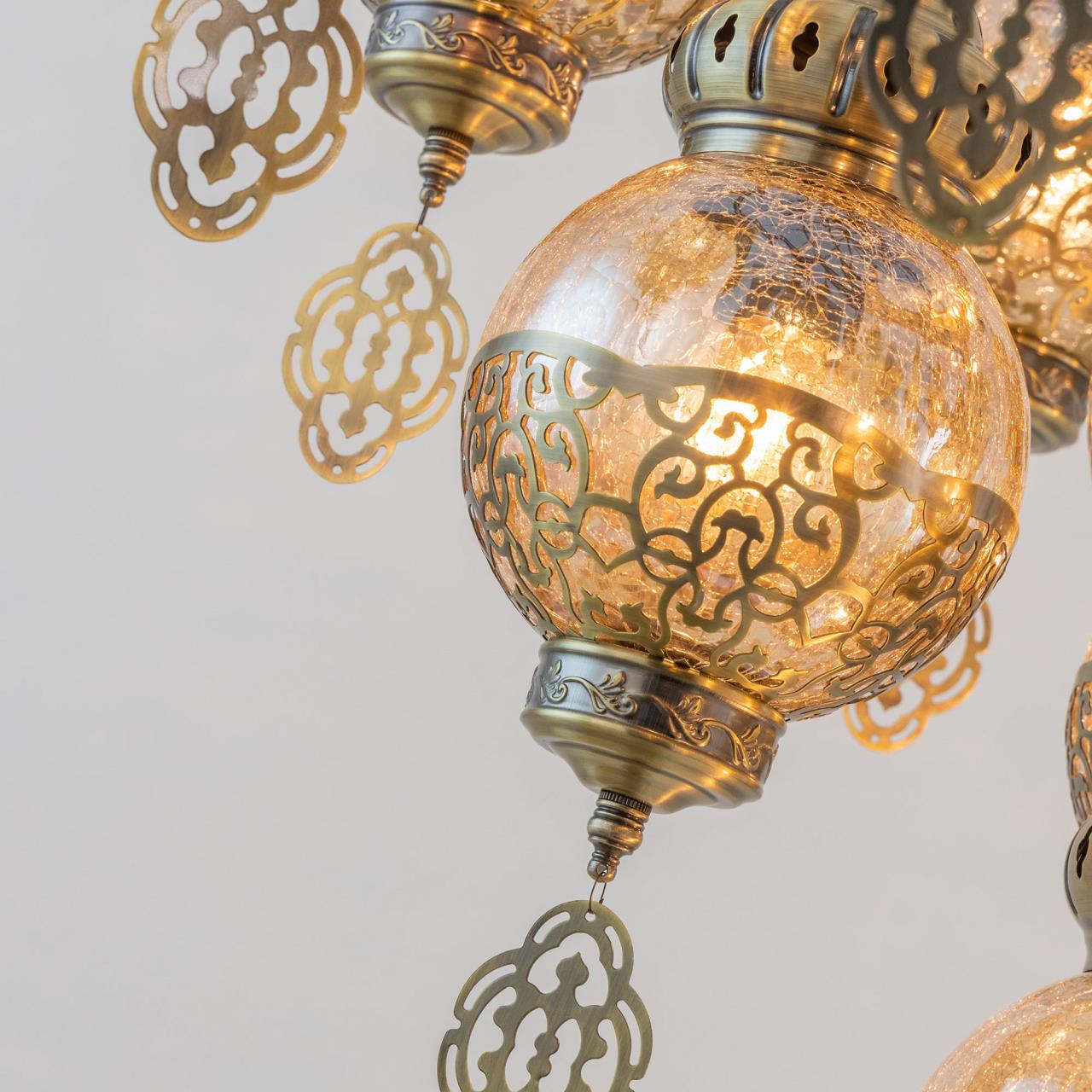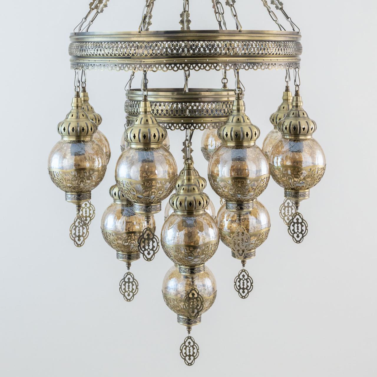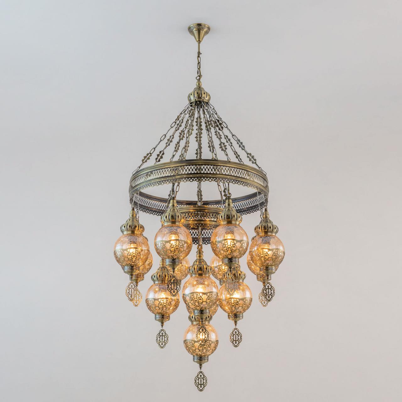 Восточная двухъярусная каскадная люстра CL419193 от производителя Citilux принадлежит к коллекции Каир с тринадцатью подвесными плафонами. Каркас металлический, цвет бронза. Плафоны в форме шара, изготовлены из прозрачного стекла медового оттенка, украшены декоративными, ажурными элементами. В изделии используются лампы с цоколем Е27, максимальной мощностью для ламп накаливания 75Вт. Светодиодные лампы можно устанавливать более яркие. Модель подходит для всех типов потолков, в том числе натяжных. Тип крепления – крючок. Люстра Каир CL419193 прекрасный вариант для атмосферного освещения интерьеров квартир и загородных домов, уютных кафе, баров и ресторанов, оформленных в восточном стиле , страна бренда Дания.Купить модель CL419193 спешите в интернет-магазине 220svet.