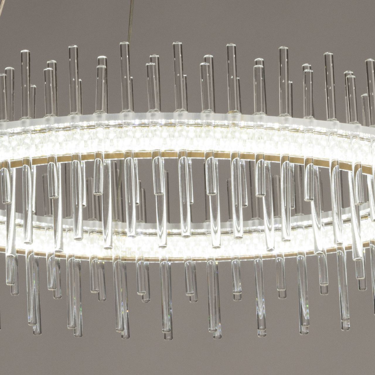 Металлическое основание подвесной люстры окрашено в цвет золота. Светильник декорирован трубочками из прозрачного стекла. Светодиодные источники закрыты прозрачным акрилом.