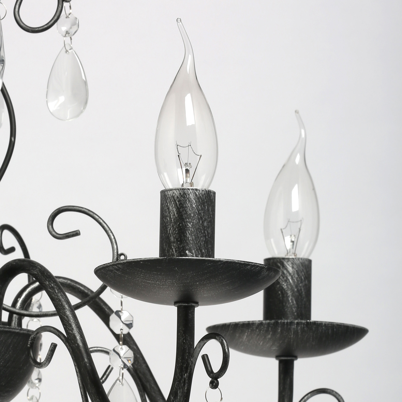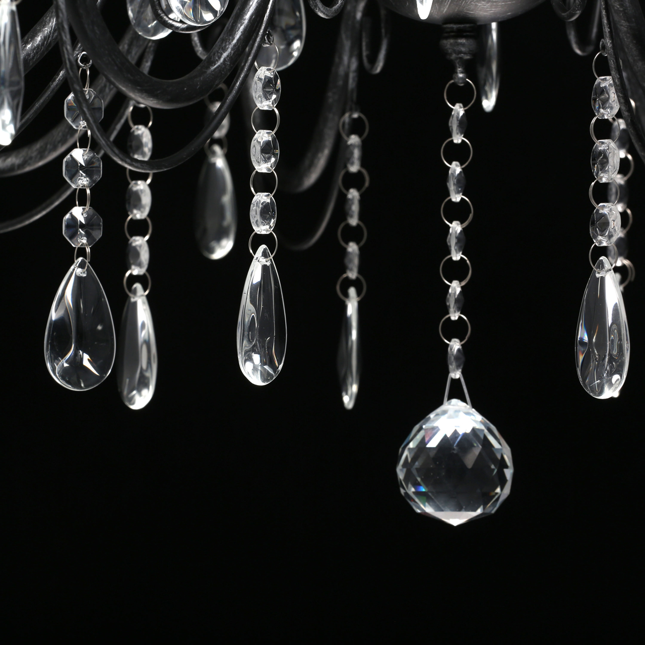 Основание светильника выполнено из металла и обработано по технологии хай-лайт, где основной слой черного цвета, а декоративный слой серебряного цвета. Светильник декорирован прозрачным хрусталем.