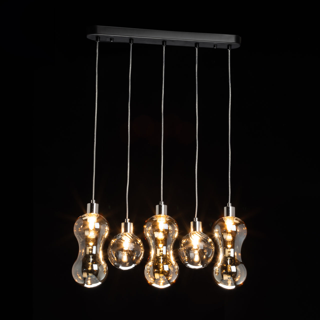 Металлическое основание подвесной люстры окрашено в черный цвет. Держатели плафонов гальванизированы в цвет хрома. Стеклянные плафоны выдуваются в сложную форму и гальванизированы в цвет шампань или в дымчатый цвет.