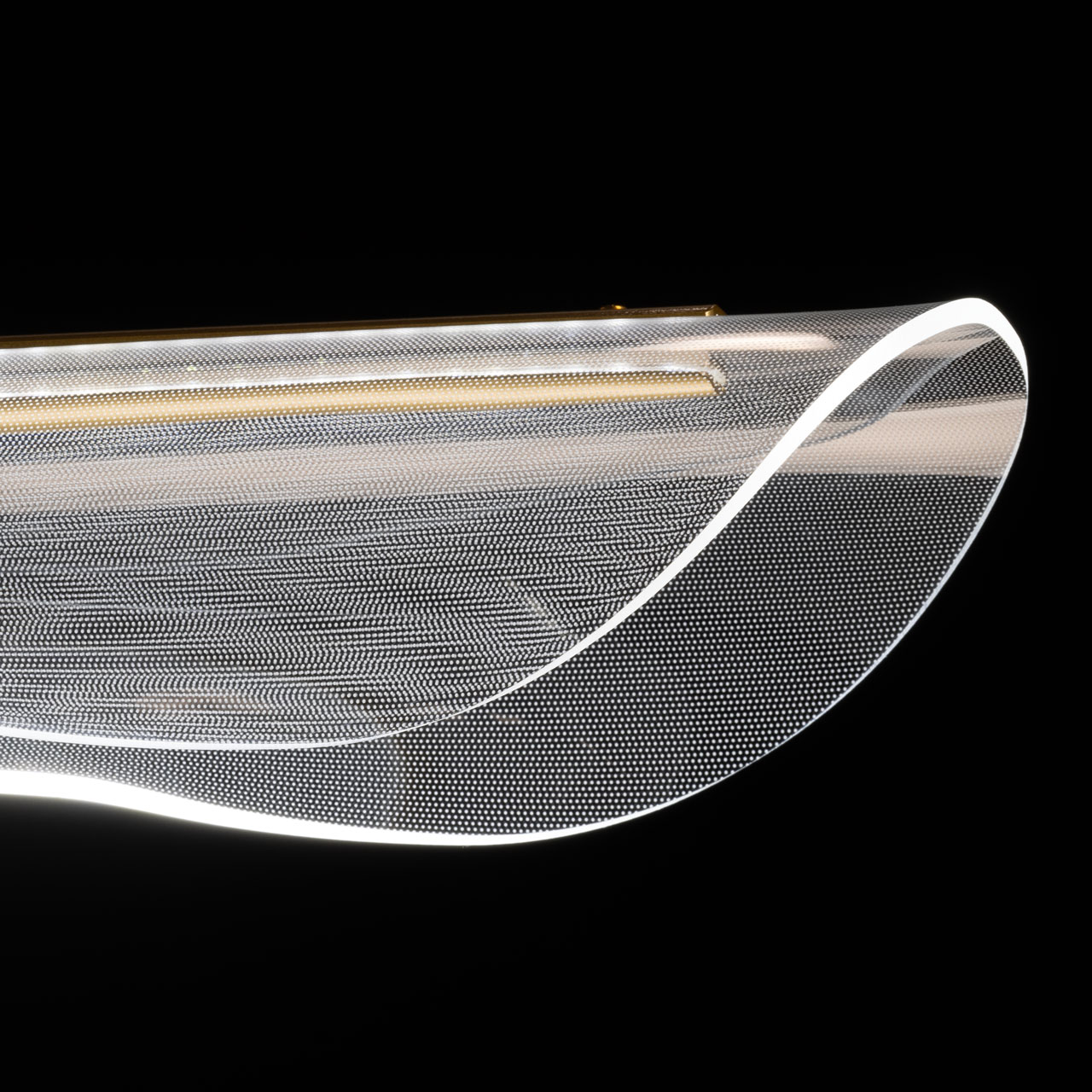 Металлическое основание подвесной люстры гальванизировано в цвет золота. Люстра декорирована прозрачным акрилом оригинальной формы.