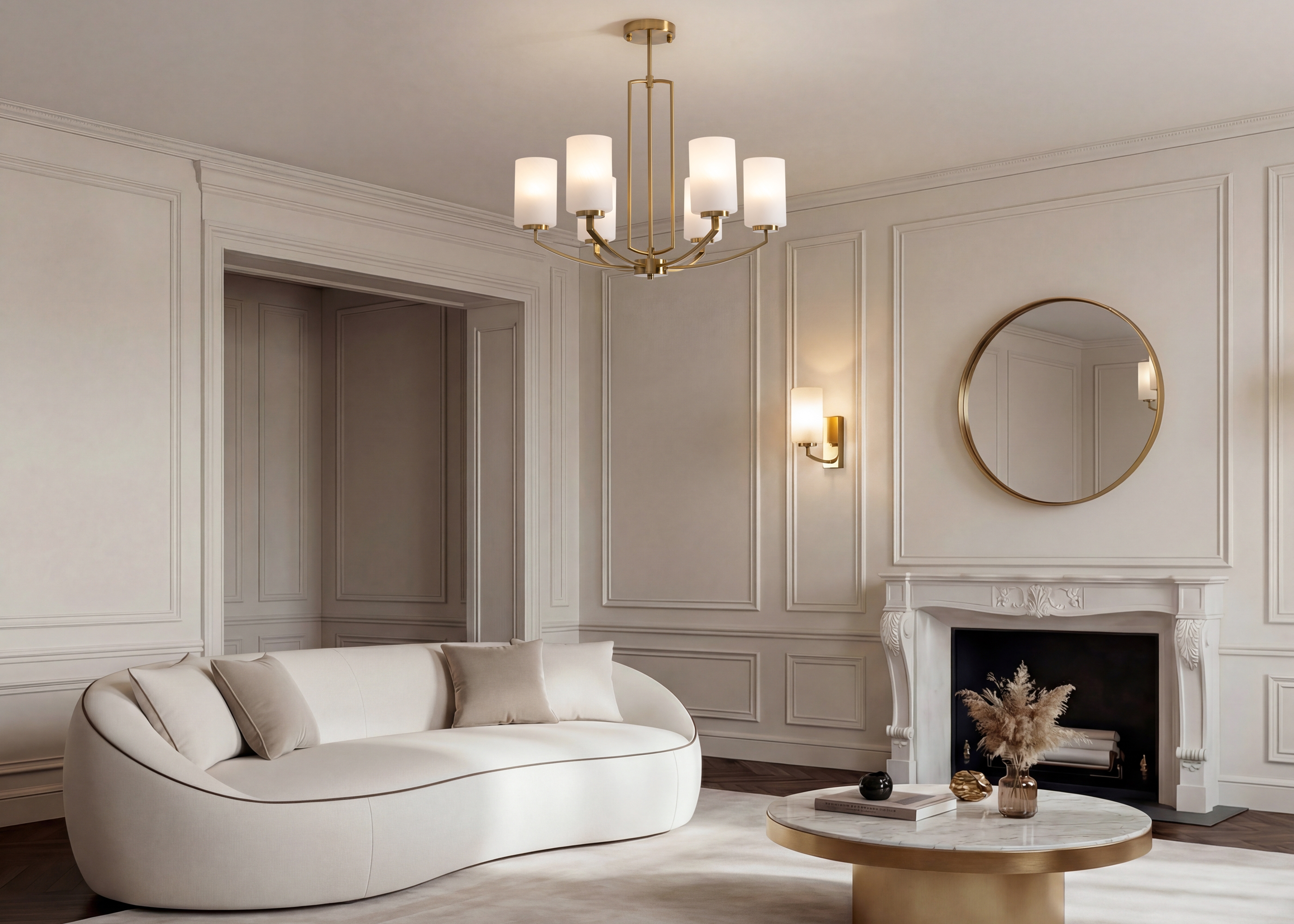 Арматура — металл, латунь. Стеклянные белые абажуры рассеивают свет. Центральное основание создаёт воздушность конструкции. Лампы E14 (5/6 шт., не в комплекте).