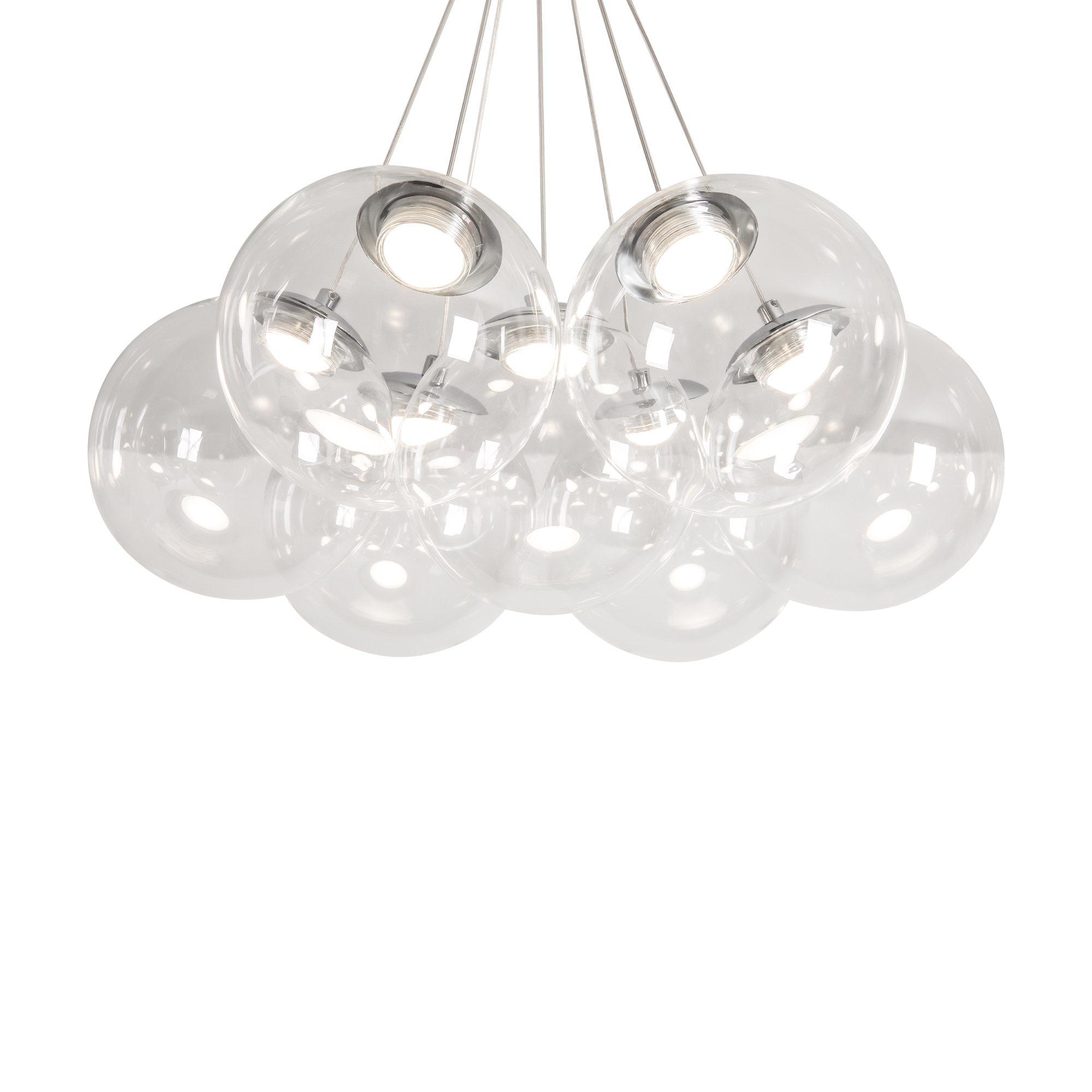 Арматура - металл (никель). Абажуры из дутого стекла с LED (2800K). Прозрачные плафоны подчеркивают современный дизайн. Высота 500-2500 мм. Серия станет ярким акцентом в вашем интерьере.