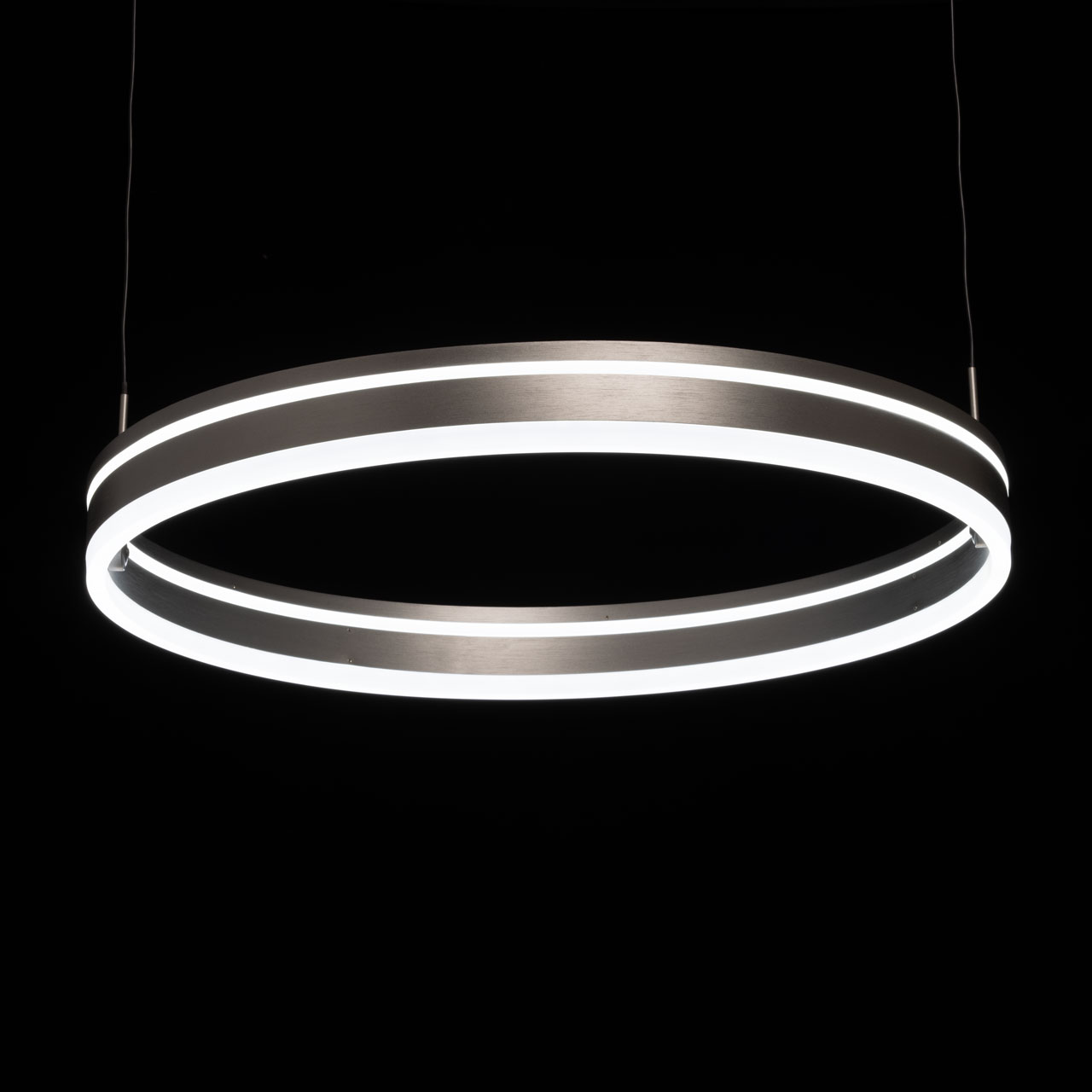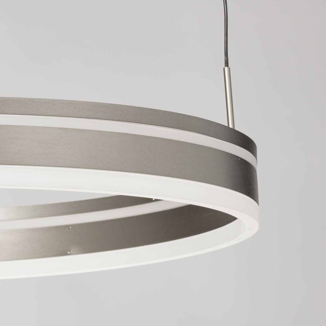 Металлическое основание подвесной люстры окрашено в черный цвет. Плафон люстры выполнен из сплава алюминия с цинком и гальванизирован в цвет графита. Светодиодные источники света закрыты белым матовым акрилом.