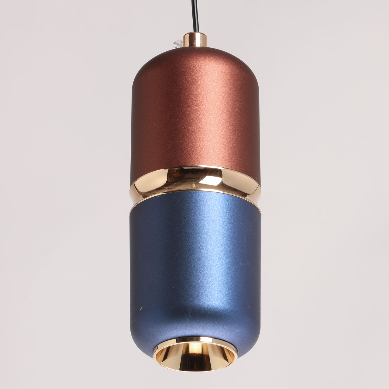 Металлическое основание подвеса окрашено в черный цвет. Корпус плафона выполнен из сплава алюминия и окрашен в синий и коричневый цвета. Отдельные элементы плафона гальванизированы в цвет золота.