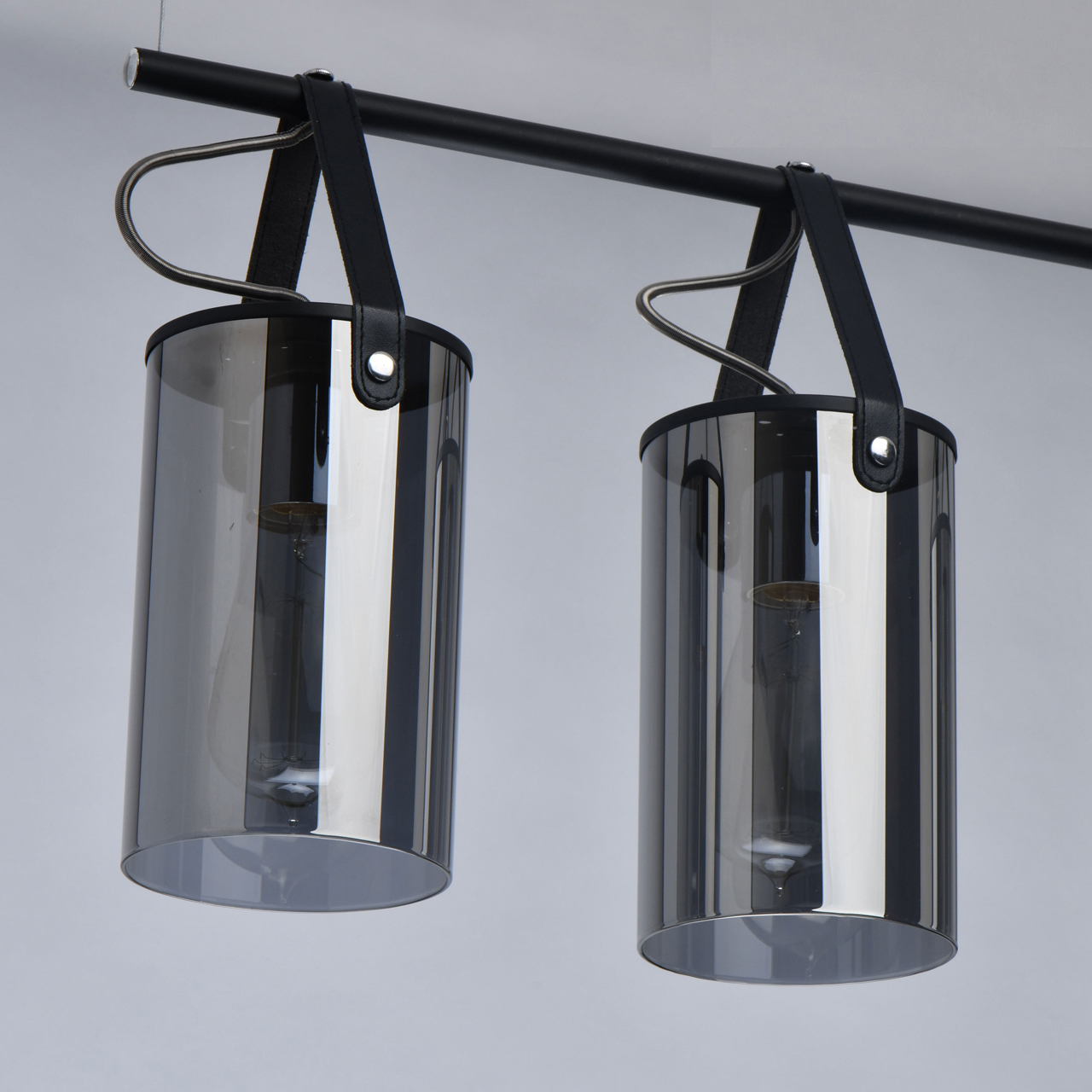 На парящей планке расположены 4 подвеса из стекла цвета антрацита. Основание из металла окрашено в черный цвет. К нему крепятся черные кожаные ремешки, которые и удерживают на весу источники освещения. Свет получается мягким, приглушенным, создает умиротворяющую, романтичную атмосферу. Модель идеально подходит для создания акцентов на конкретных зонах: подсветки обеденного стола, барной стойки, зоны отдыха.