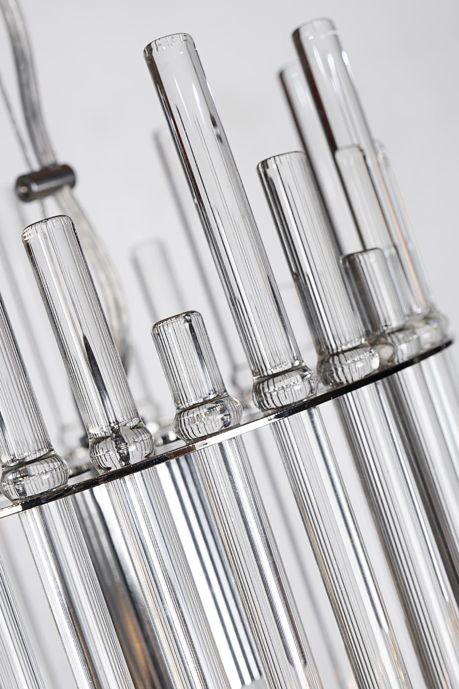 Ни один современный интерьер не может обойтись без искусственного освещения. Для того, чтобы придать ему выразительность, лучше всего использовать дизайнерский подвесной потолочный светильник. Этой модели присуще изысканное очарование, которое свойственно практически всем изделиям в стиле ар-деко. Декоративную функцию в модели выполняют подвесы в форме трубочек. Благодаря такому декору светильник из прозрачного стекла при включенном свете создает фантастическое сияние. Кронштейн аксессуара имеет плавно изогнутую форму, которая отлично гармонирует с подвесами стеклянного потолочного светильника. Рекомендуемая площадь освещения 3 м2.
