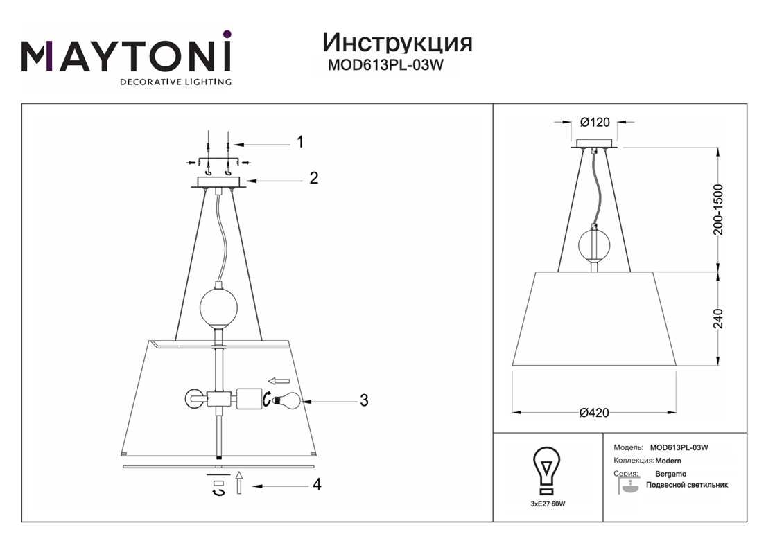 Подвесной светильник Maytoni Bergamo MOD613PL-03W — это модель, которая максимально функциональна. Благодаря трем источникам света с типом цоколя E27 и мощностью 60 Вт каждый, этот осветительный прибор имеет общую мощность 180 Вт и обеспечивает комфортное и равномерное освещение на площади в 10 квадратных метров, создавая уютную атмосферу в вашем доме.