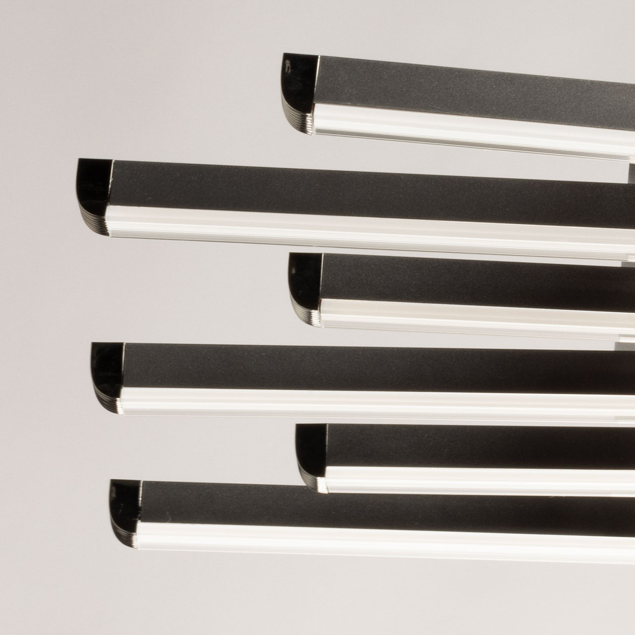 Металлическое основание потолочной люстры окрашено в цвет графита. Светодиодные источники свет закрыты белым акрилом.