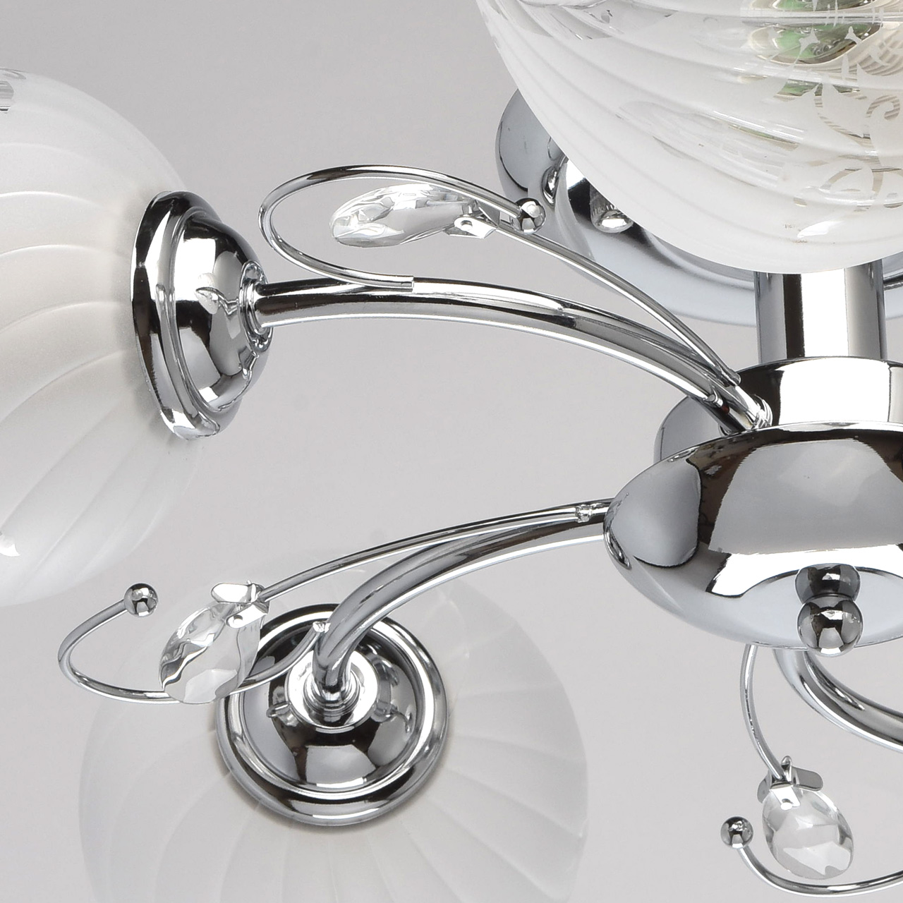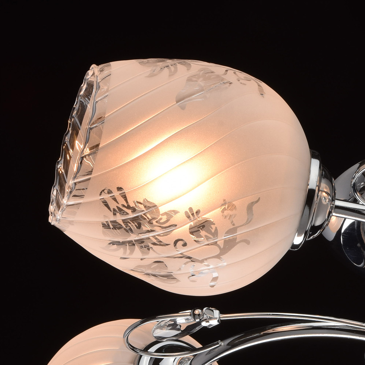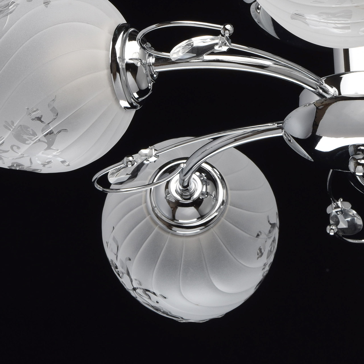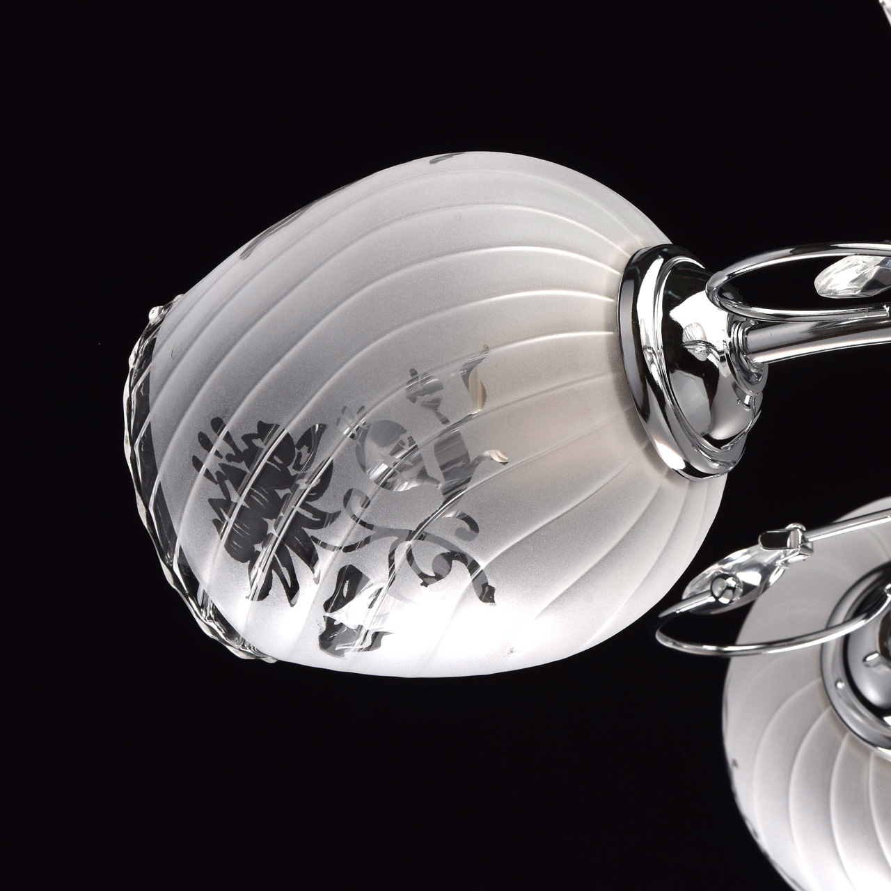 Конструкция светильника состоит из металлического хромированного основания и изогнутых рожков, дополненных декоративными элементами со стеклянными каплями миндалевидной формы. 5 плафонов из стекла матированы в белый цвет с нанесением флористического узора по трафарету. Они расположены в разных направлениях, что позволяет свету равномерно распределяться по комнате и охватывать большую площадь.