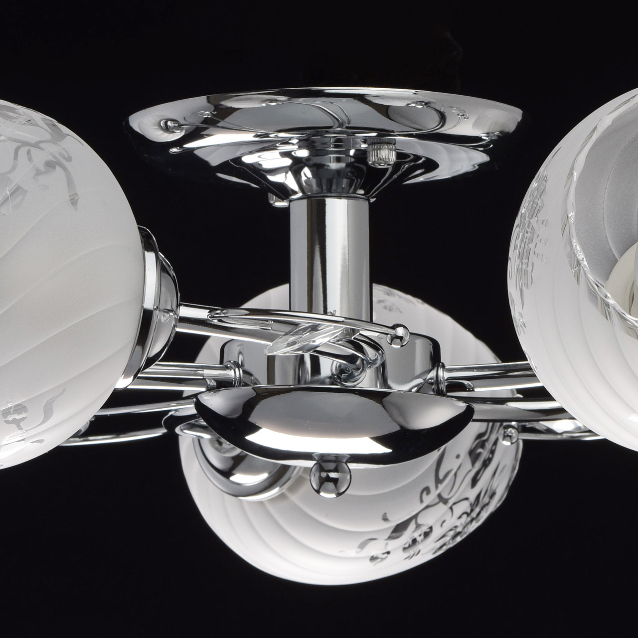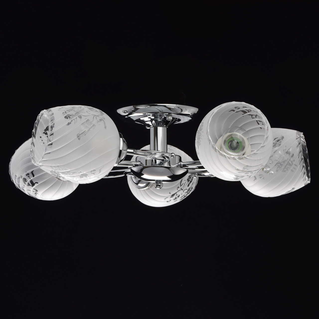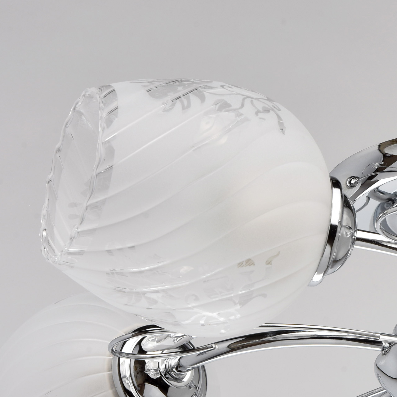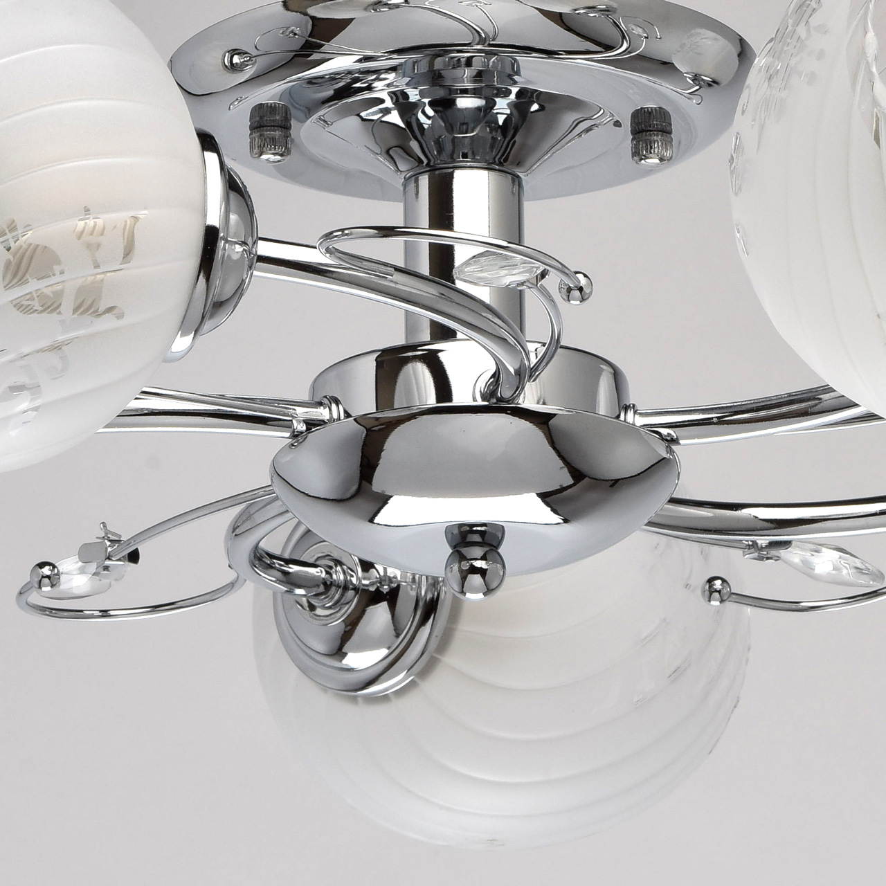 Конструкция светильника состоит из металлического хромированного основания и изогнутых рожков, дополненных декоративными элементами со стеклянными каплями миндалевидной формы. 5 плафонов из стекла матированы в белый цвет с нанесением флористического узора по трафарету. Они расположены в разных направлениях, что позволяет свету равномерно распределяться по комнате и охватывать большую площадь.