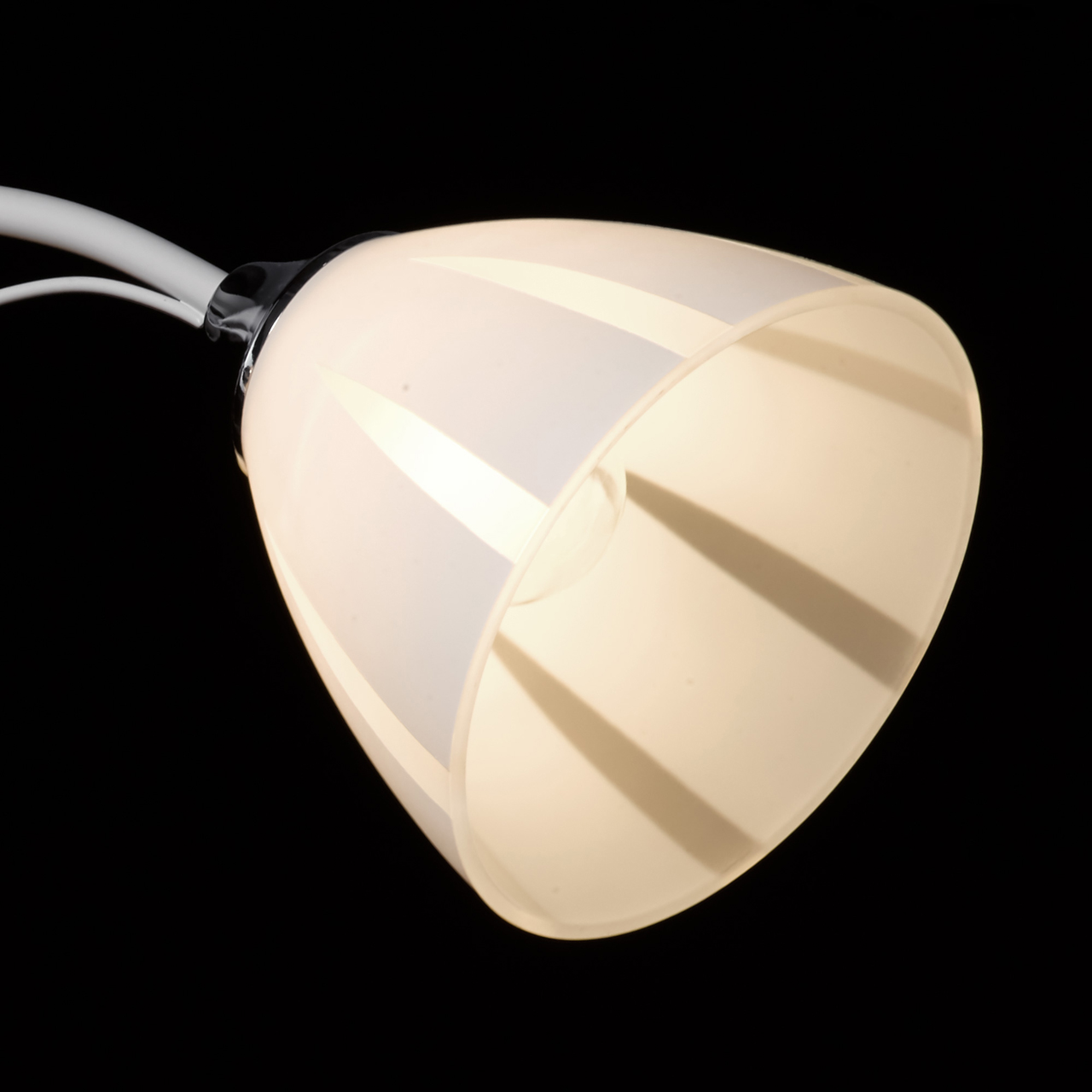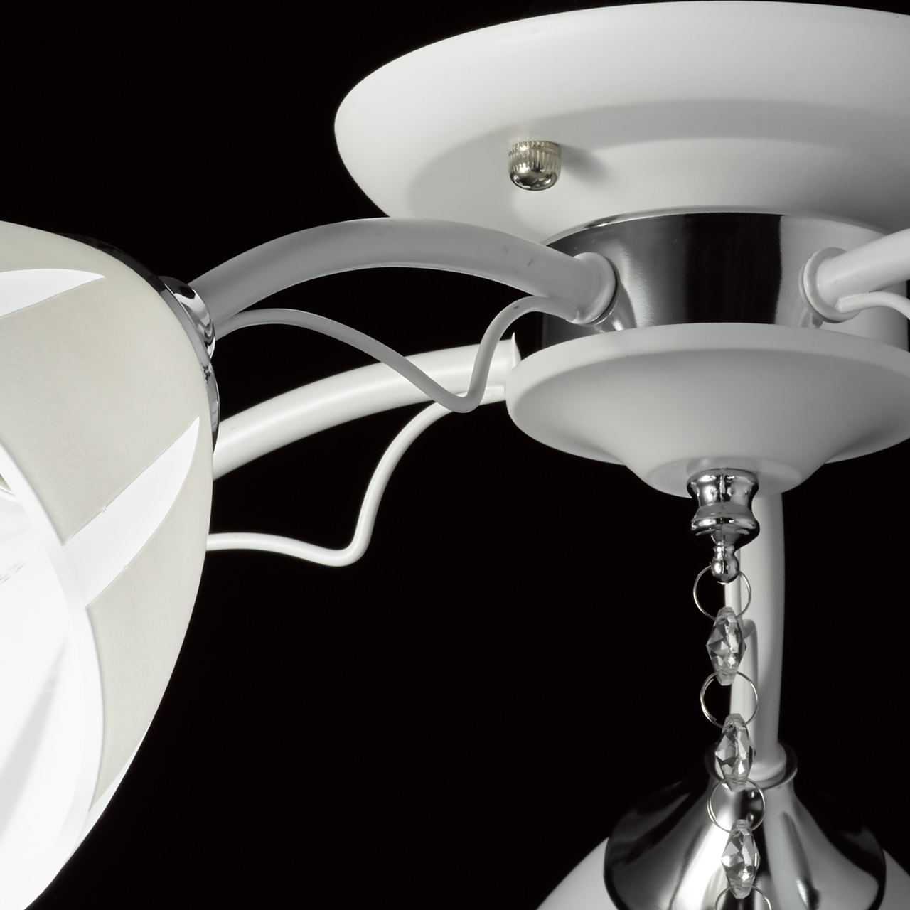 Металлическое основание окрашено в белый, как и изогнутые рожки. Держатели плафонов хромированы, контраст выглядит свежо и органично. Стеклянные плафоны матированы и покрыты белой краской по трафарету. Оригинальный рисунок создает иллюзию сложной формы и объема. Дополнительным декором служит крупный хрустальный шар, завершающий композицию.