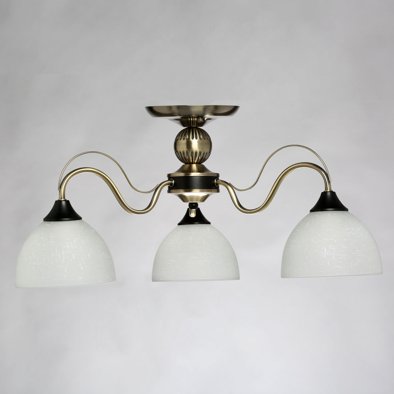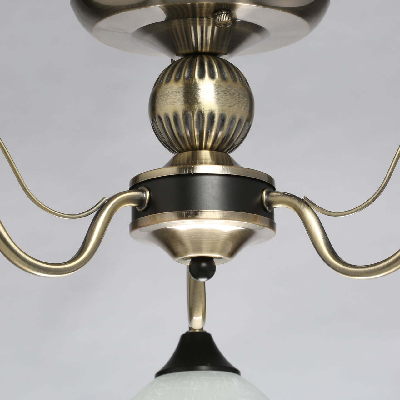 Металлическое основание гальванизировано в цвет античной бронзы. Отдельные элементы основания окрашены в черный цвет. Светильник декорирован стеклянными плафонами, отлитыми в форму. Плафоны матированы и окрашены вручную. На плафоны белым цветом нанесен рисунок в виде паутинки.