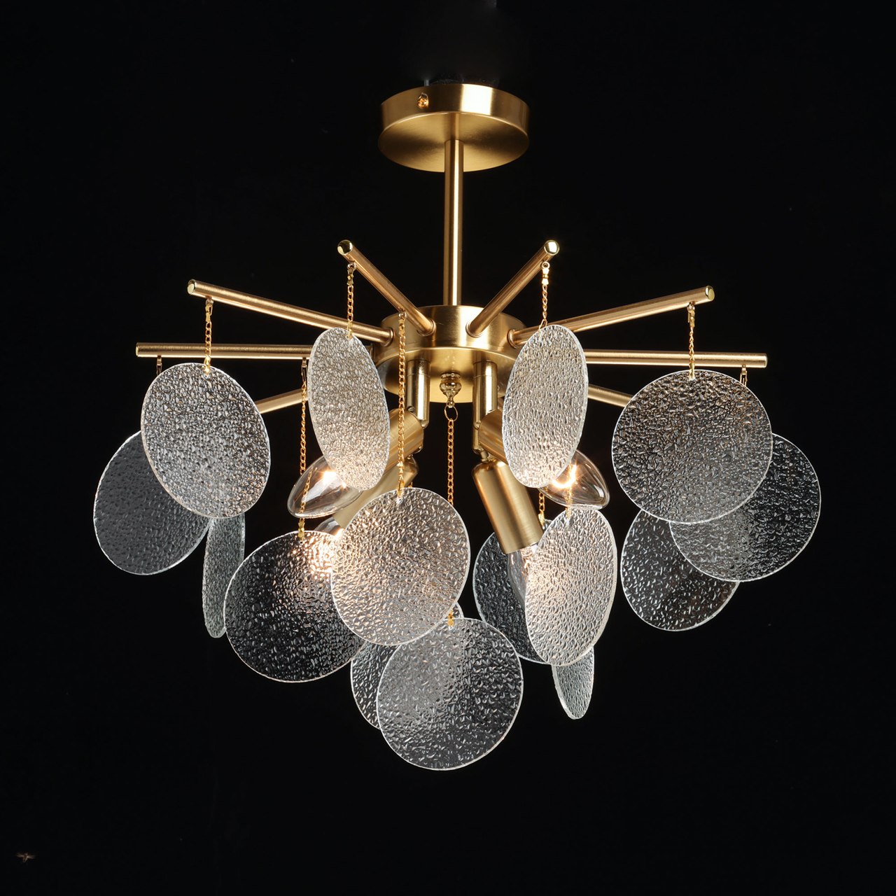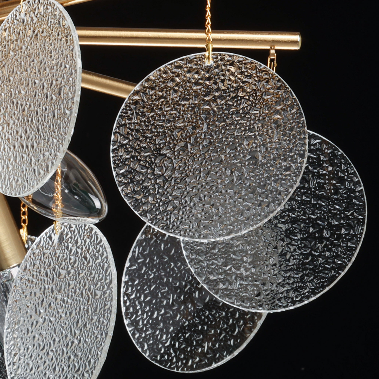 Металлическое основание подвесной люстры гальванизировано в цвет латуни. Люстра декорирована подвесками из фактурного полупрозрачного стекла.
