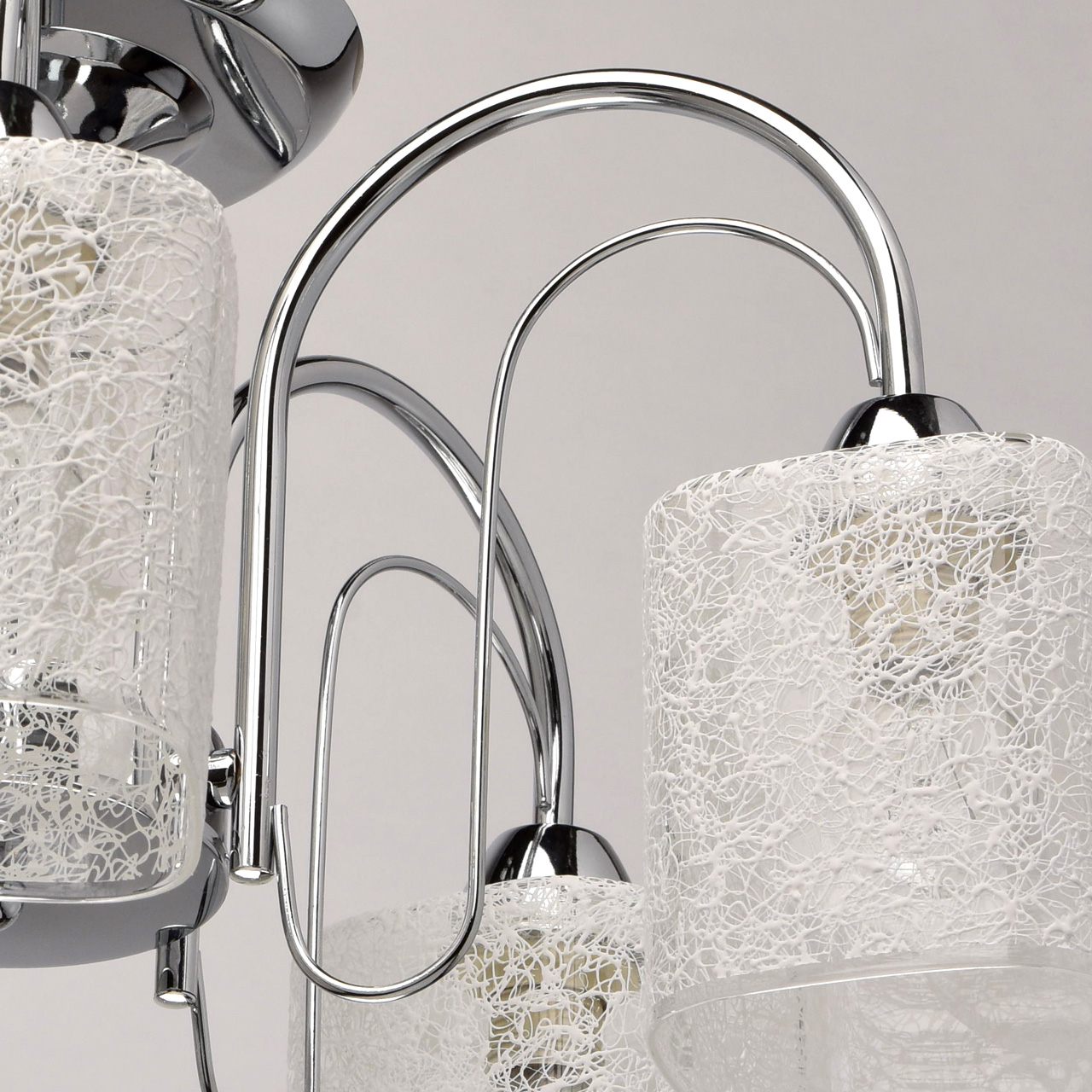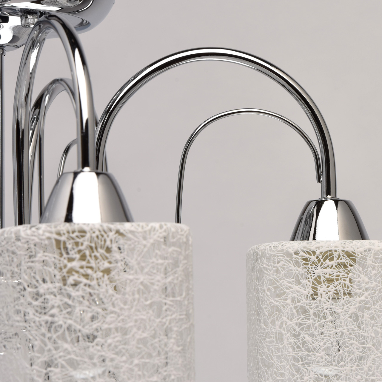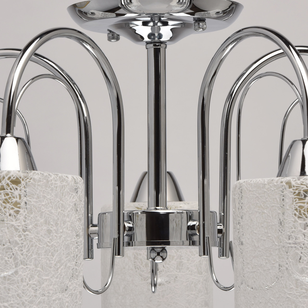 Основание: сплав металла, гальванизировано в цвет хрома. Потолочная чаша, декоративные розетки, корпус: обработка на токарном станке.Рожки, декоративные элементы: прокат на роликовом станке.Плафоны: прозрачное стекло, на стекло нанесен вручную хаотичный рисунок белой краской.