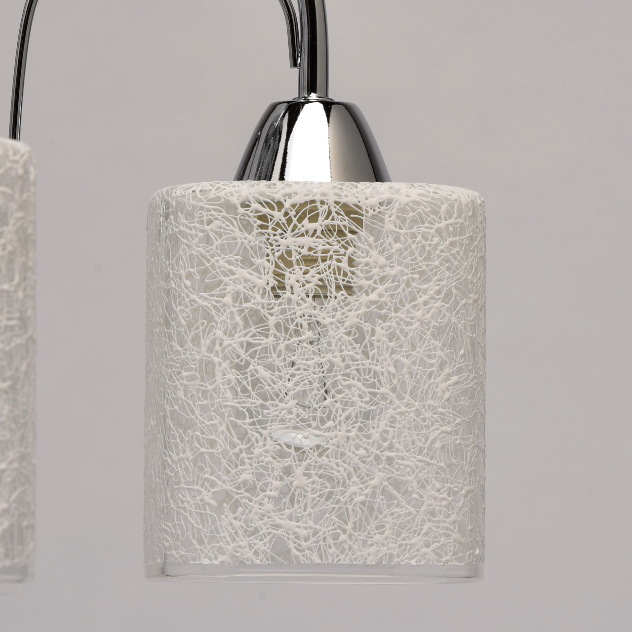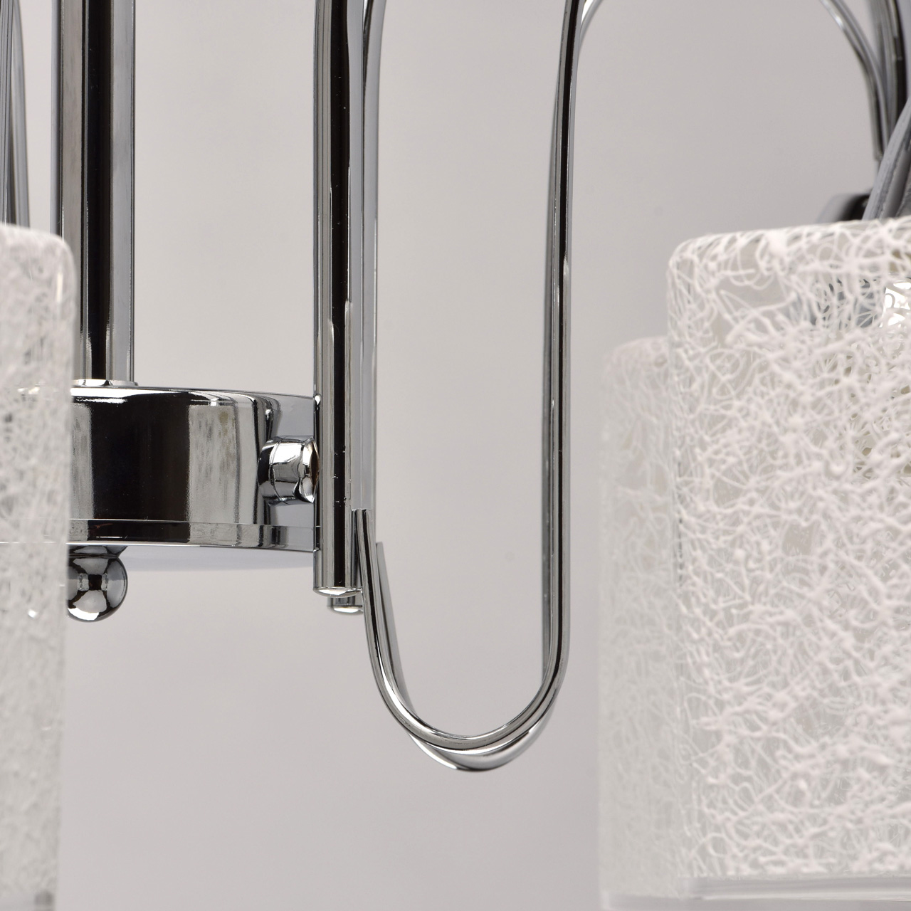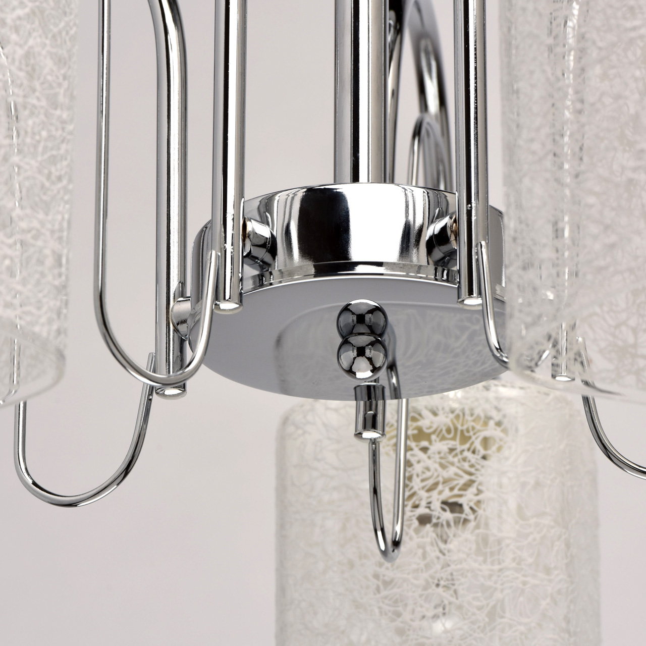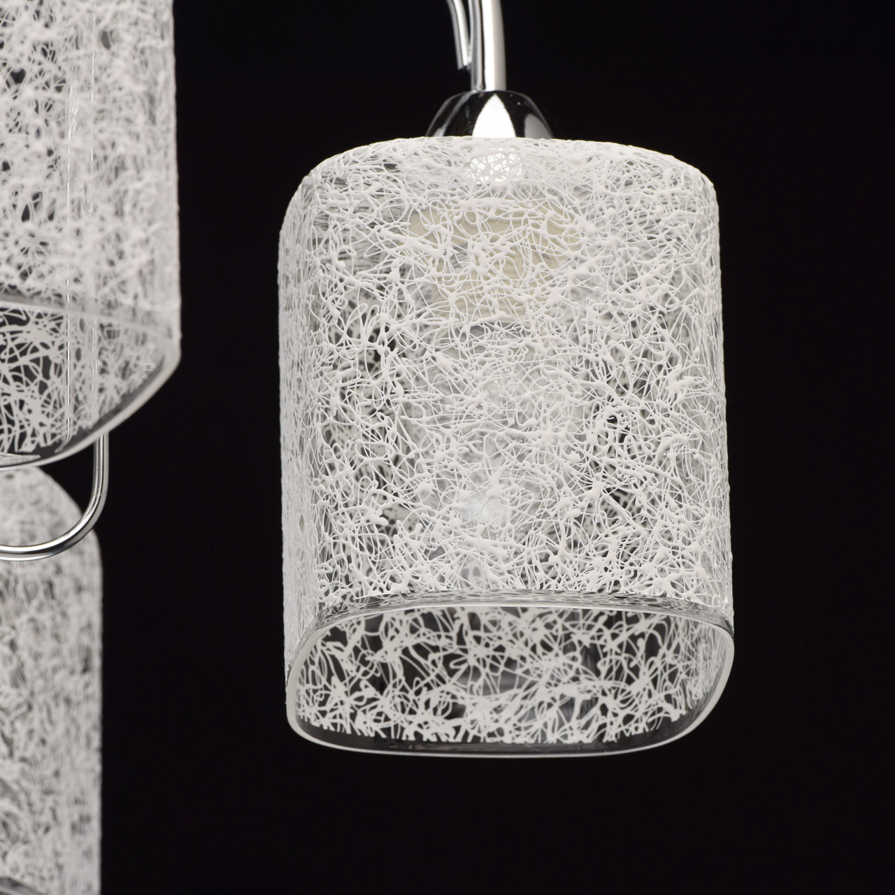 Основание: сплав металла, гальванизировано в цвет хрома. Потолочная чаша, декоративные розетки, корпус: обработка на токарном станке.Рожки, декоративные элементы: прокат на роликовом станке.Плафоны: прозрачное стекло, на стекло нанесен вручную хаотичный рисунок белой краской.