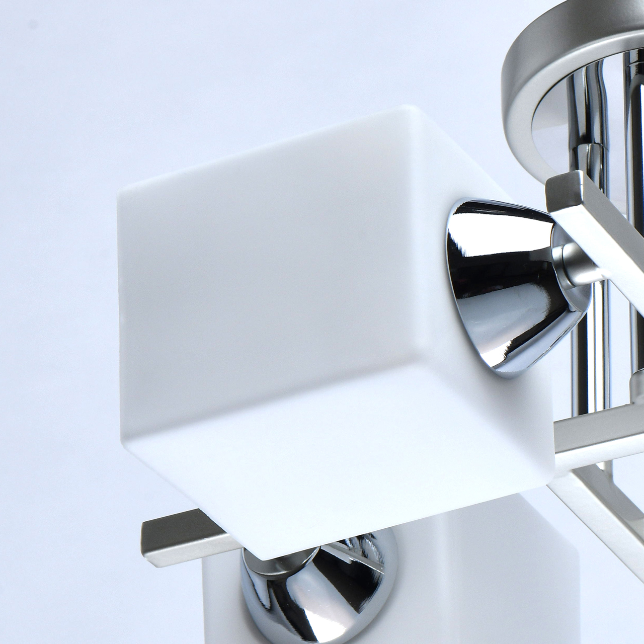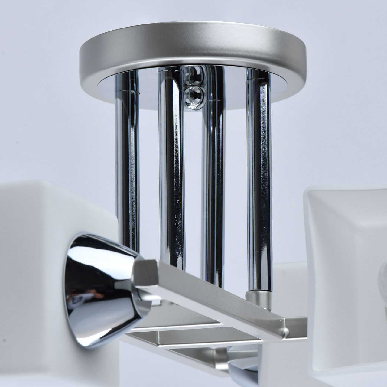 Основание светильника выполнено из металла и окрашено в цвет перламутрового серебра. Отдельные элементы основания гальванизированы в цвет хрома. Светильник декорирован стеклянными плафонами, окрашенными в белый цвет с внутренней стороны.