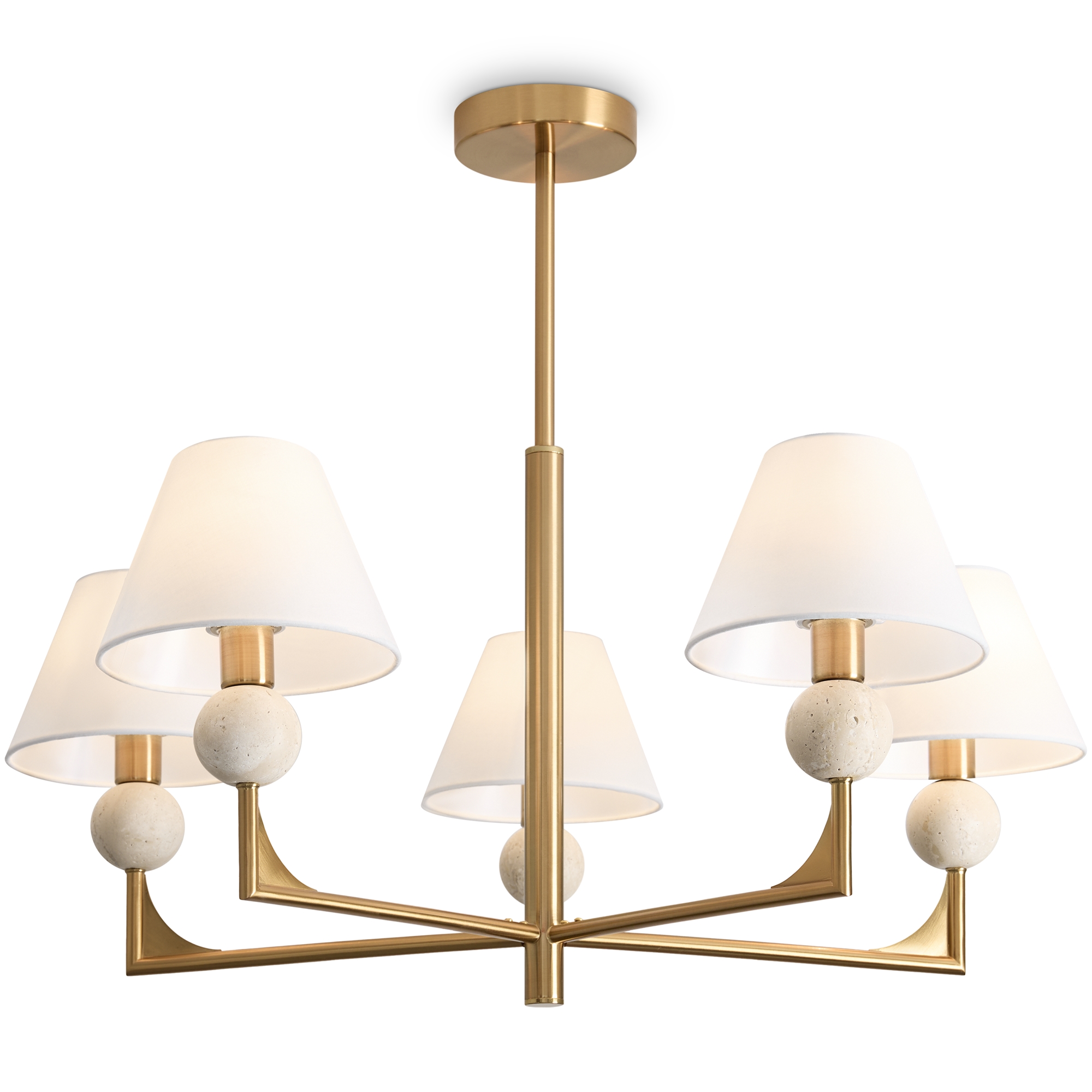 Материал арматуры — металл. Цвет металла — латунь. Абажуры выполнены из белой ткани, которые мягко рассеивают свет. Потолочные и настенные светильники с цоколем E14. Декоративные элементы в форме шара на плафоне выполнены из травертина. Металлическая форма арматуры строгой геометрической формы с пластинами из латуни. Подходит для оформления элегантных классических пространств. Данную модель FR2043CL-05BS с быстрой доставкой спешите купить в магазине 220svet.ru