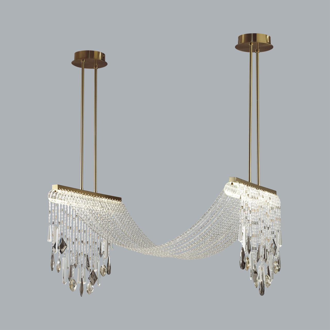 Afina - линия светильников, вдохновленная греческими мотивами. Струящиеся хрустальные нити из прозрачного, дымчатого и коньячного хрусталя создают притягательную игру переливов и отблесков. В моделях LED-источник света с цветовой температурой 3000K. В люстре предусмотрено два варианта высоты на выбор - 765 мм, либо 965 мм, высота изменяется с помощью установки штанги нужной длины, оба варианта штанги поставляются в комплекте с светильником. Плафон, через который перекинуты хрустальные нити - из прозрачного стекла.