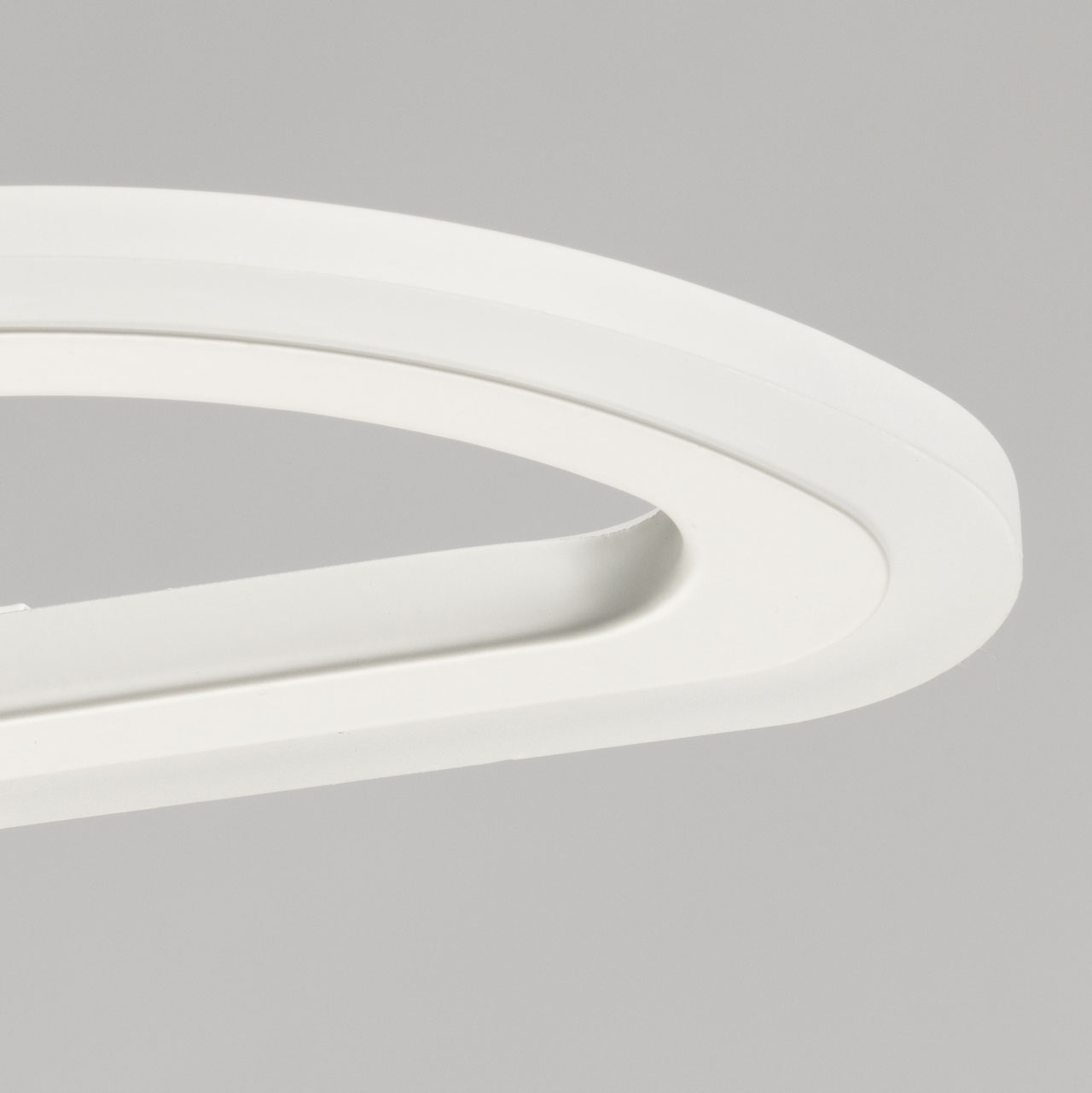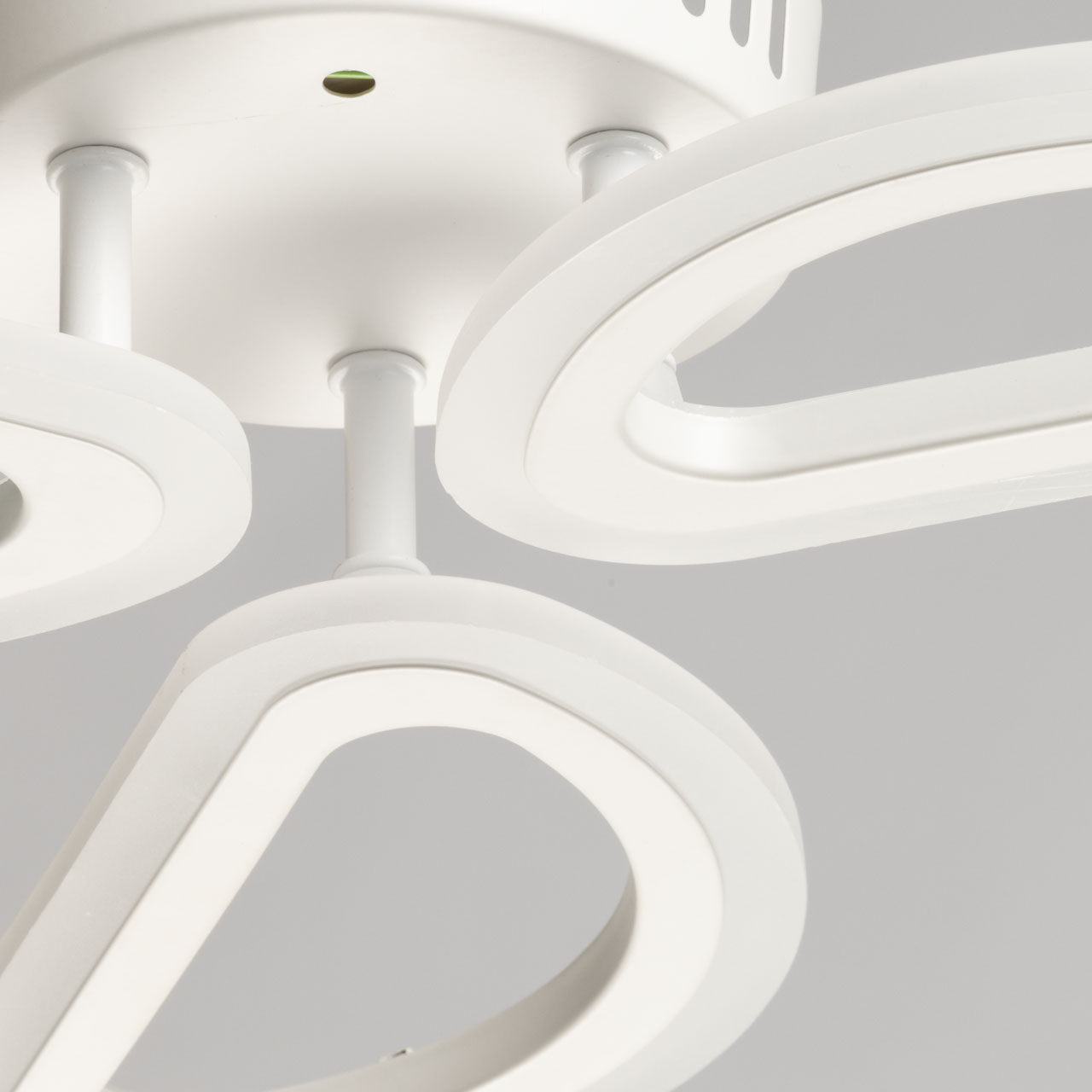 Металлическое основание потолочной люстры окрашено в белый цвет. Корпус плафонов выполнен из сплава алюминия с цинком и окрашен в цвет основания. Светодиодные источники света закрыты белым матовым акрилом.