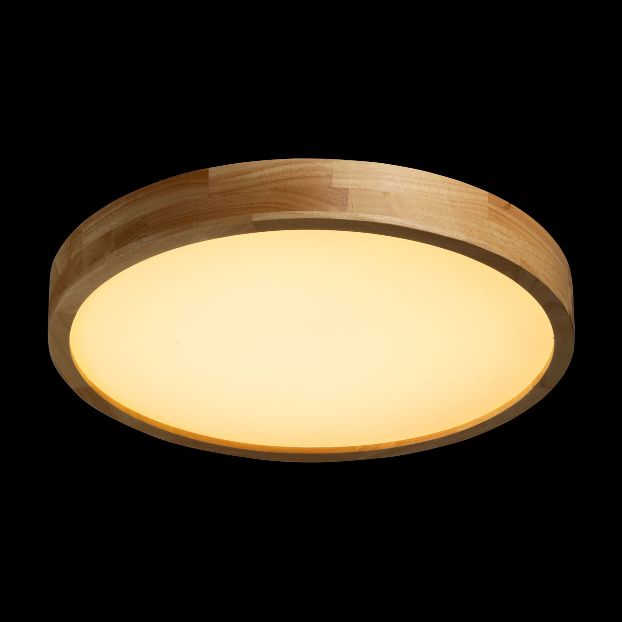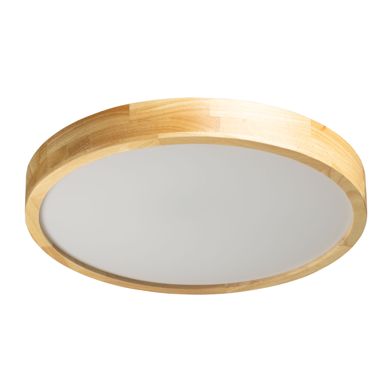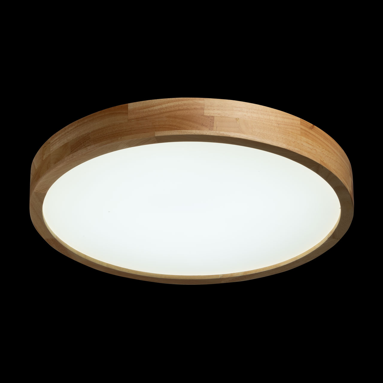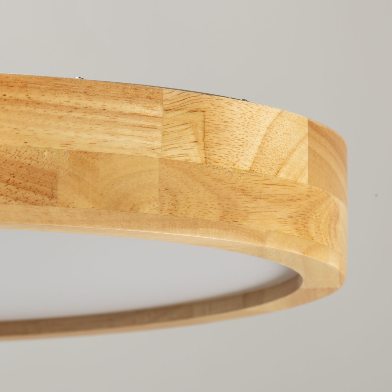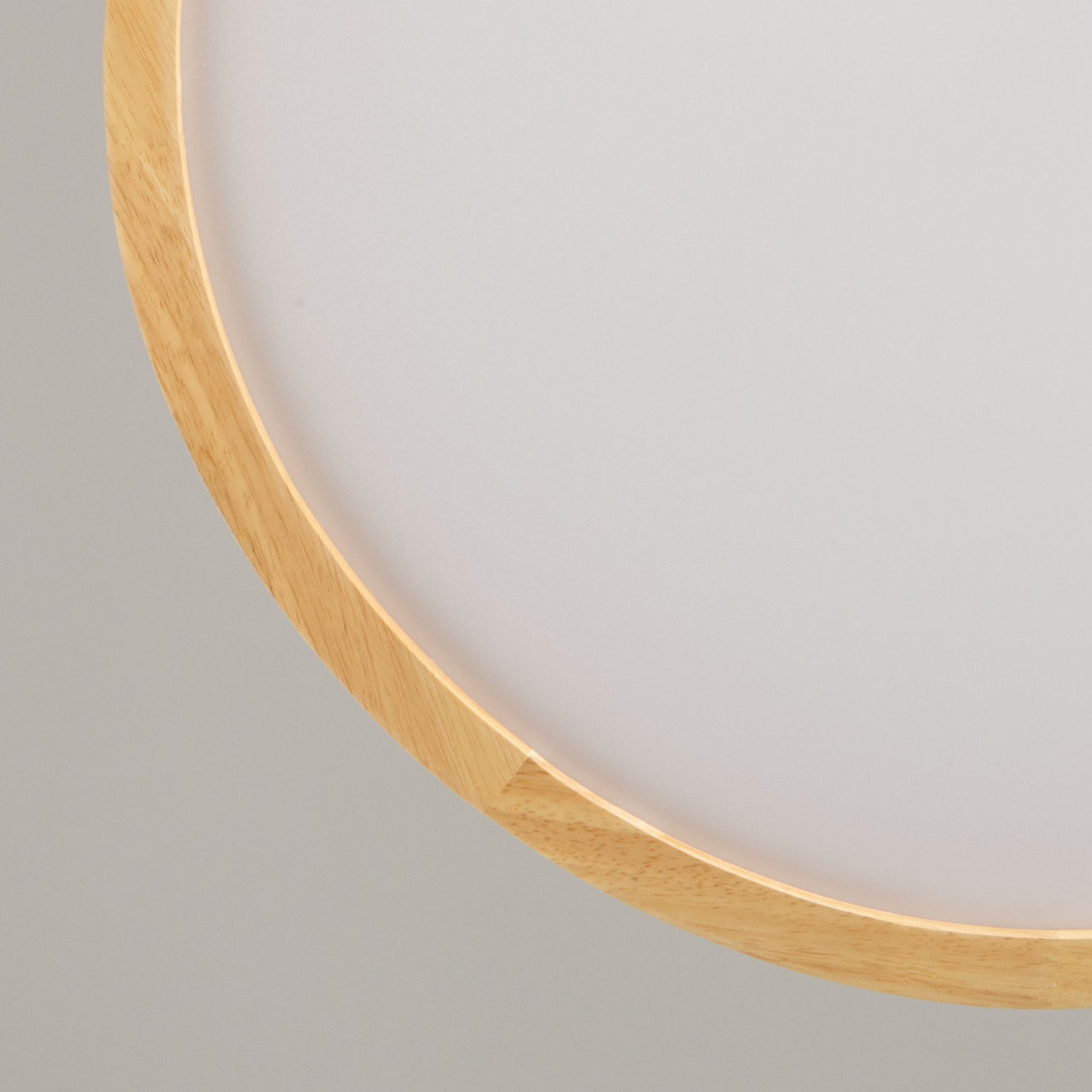 Металлическое основание светильника окрашено в белый цвет. Плафон выполнен из натурального дерева. Светодиодные источники света закрыты белым матовым акрилом.