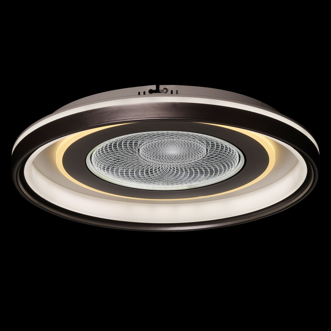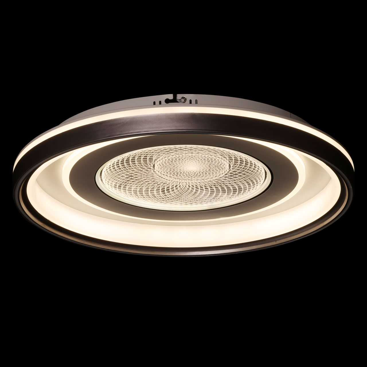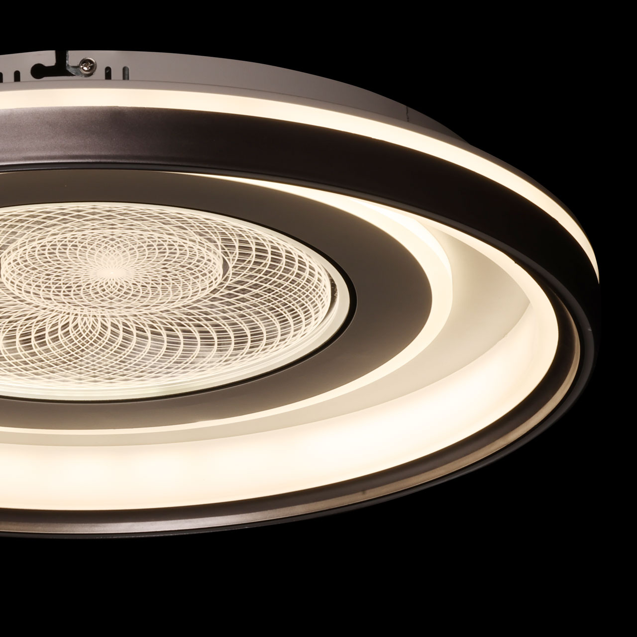 Металлическое основание потолочной люстры окрашено в белый цвет. Корпус плафона выполнен из сплава алюминия с цинком и окрашен в серый и белый цвета. Светодиодные источники света закрыты прозрачным акрилом с 3D-эффектом. Светодиоды по периметру плафона закрыты белым матовым силиконом.