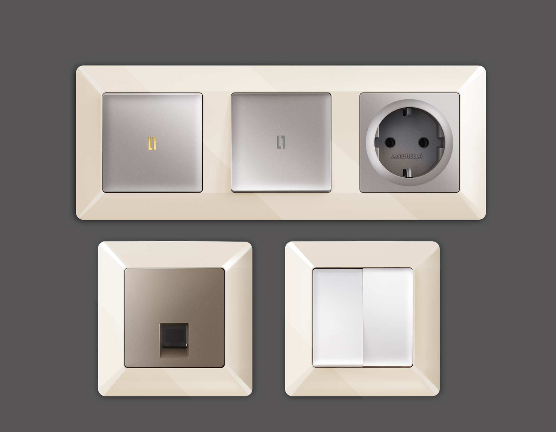 Многогранный ассортимент Ambrella Volt включает в себя механизмы, лицевые панели и рамки, а также комплекты, доступные в различных цветовых решениях. Продукция представлена в модульном исполнении, что позволяет гибко настраивать внешнийвид и функциональность. Вам будет легко заменить лицевую панель, рамку или механизм, найдя идеальное сочетание цветов.