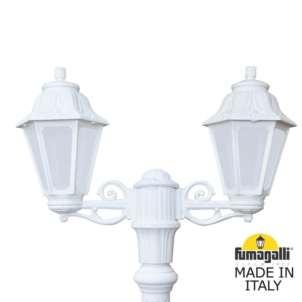 Садово-парковый фонарь FUMAGALLI серии ANNA, модель ANNA/ARTU/BISSO 2L. Парковый торшер, столб ARTU с двумя уличными фонарями ANNA на малых консолях BISSO. Используются для архитектурного и ландшафтного освещения в стиле "классика". Место установки столбиков освещения - парковые дорожки, cкверы, садовые участки, тротуары, а так же ландшафтные и архитектурные объекты. Изготовлены в Италии, по уникальным технологиям "FUMAGALLI" из современного композитного полимера RESIN. Этот материал в 5 раз прочнее металла, не ржавеет, не окисляется, не выгорает на солнце, его не нужно красить. Все светильники пыле-влаго защищены по стандарту IP55 (защита от пыли, защита от струй воды, падающих под любым углом). Рассеиватель выполнен из антивандального, не мутнеющего и не горючего PMMA (ПолиМетилМетаАкрилат). Срок службы светильника - не менее 20 лет. Температура использования от -60 до +90. В серии ANNA есть фонари в настенном (BISSO/ANNA, PORPORA/ANNA) подвесном (SICHEM/ANNA, SICHEM/ANNA 3L) и наземном исполнении (IAFAET.R/ANNA, ALOE.R/ANNA, ARTU/ANNA, GIGI/ANNA, RICU/ANNA, RICU/ISSO/ANNA 1L, RICU/ISSO/ANNA 2L, RICU/ISSO/ANNA 3L) со столбами разной высоты, с разным количеством и конфигурацией голов. Консоли настенных фонарей и кронштейны светильников на столбах освщения могут устанавливаться вверх/вниз. Столбы выше 150 см имеют в основе мощную стальную трубу с двойной оцинковкой. При заказе требуется выбрать цвет корпуса, цвет плафона и тип патрона (Е-27 или LED GX-53). Возможен светодиодный вариант. По стилю и дизайну серия уличных светильников ANNA похожа на светильники среднего размера серии RUT и на светильники большого размера серии NOEMI. По размеру ANNA относится к малым светильникам как серия SABA и GLOBE 250.