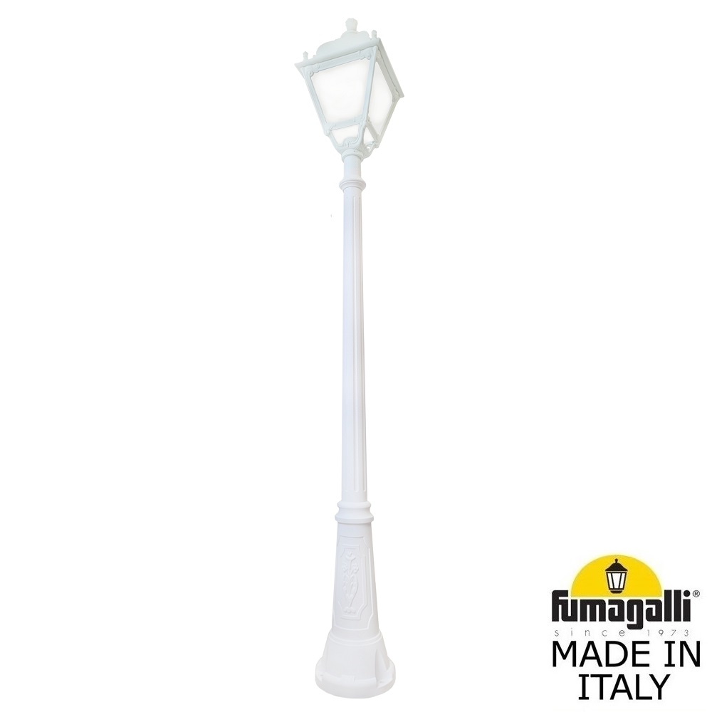 Садово-парковый фонарь FUMAGALLI среднего размера серии SIMON, модель RICU/SIMON. Парковый фонарь с 1 венчающим светильником большого размера в на классическом столбе RICU высотой 2,0 м (+высота фонаря). Предназначен для освещения парковых дорожек, cкверов, садовых и ландшафтных композиций, и других общественных пространств. Используется в качестве основного уличного освещения на городских улицах и площадях. Изготовлены в Италии, по уникальным технологиям "FUMATECH" из современного композитного полимера RESIN. Этот материал в 5 раз прочнее металла, не ржавеет, не окисляется, не выгорает на солнце, его не нужно красить. Все светильники пыле-влаго защищены по стандарту IP55 (Пылезащищенные, защита от водяных струй с любого направления). Рассеиватель выполнен из антивандального, не мутнеющего и не горючего PMMA (ПолиМетилМетаАкрилат). Срок службы светильника - не менее 20 лет. Температура использования от -60 до +90. В серии SIMON есть садовые фонари в настенном (OFIR/SIMON, MIRRA/SIMON) подвесном (SICHEM/SIMON) и наземном исполнении (IAFAET.R/SIMON, ALOE.R/SIMON, ARTU/SIMON, GIGI/SIMON, RICU/SIMON, NEBO/OFIR/SIMON 1L, NEBO/OFIR/SIMON 2L, TABOR/ADAM/SIMON 3L) со столбами разной высоты, с разным количеством и конфигурацией голов. Консоли настенных фонарей и кронштейны светильников на столбах освещения могут устанавливаться в положение вверх и вниз. Столбы выше 150 см имеют в основе мощную стальную трубу с двойной оцинковкой. При заказе требуется выбрать цвет корпуса, цвет плафона и тип патрона (Е-27 или LED GX-53). Возможен светодиодный вариант. По стилю и дизайну серия уличных светильников SIMON похожа на светильники среднего размера серии CEFA. По размеру относится к большим парковым светильникам как серия NOEMI и GLOBE 400.