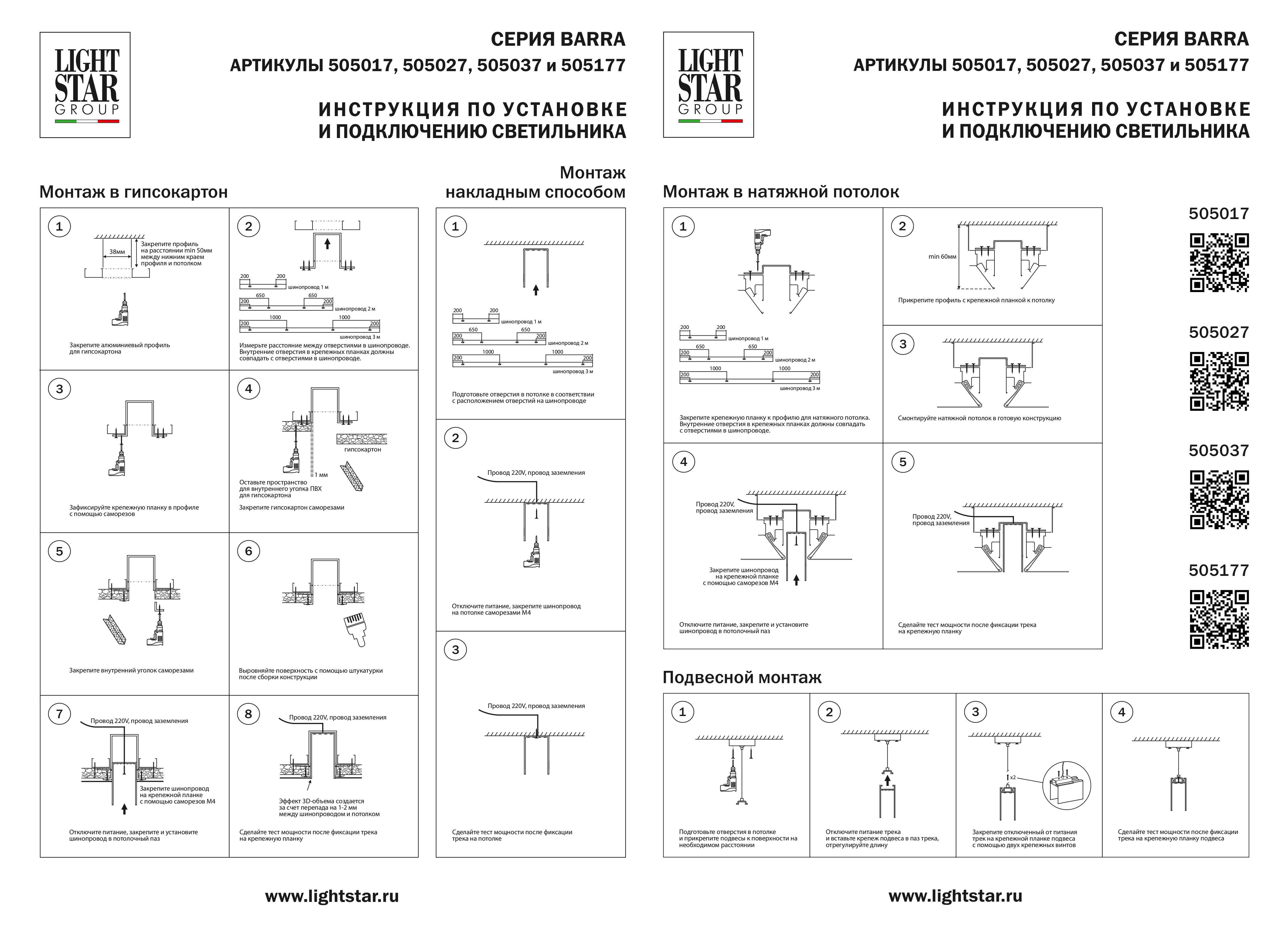 Для установки под натяжной потолок необходимо дополнительно приобрести профиль для натяжного потолка и крепеж Lightstar Barra 505170